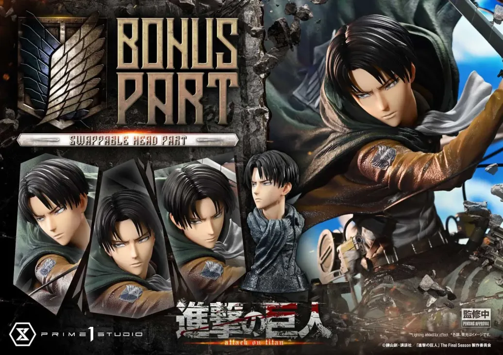 - Zwei (2) austauschbare Levi-Köpfe (Entschlossenheit, Kampfschrei)