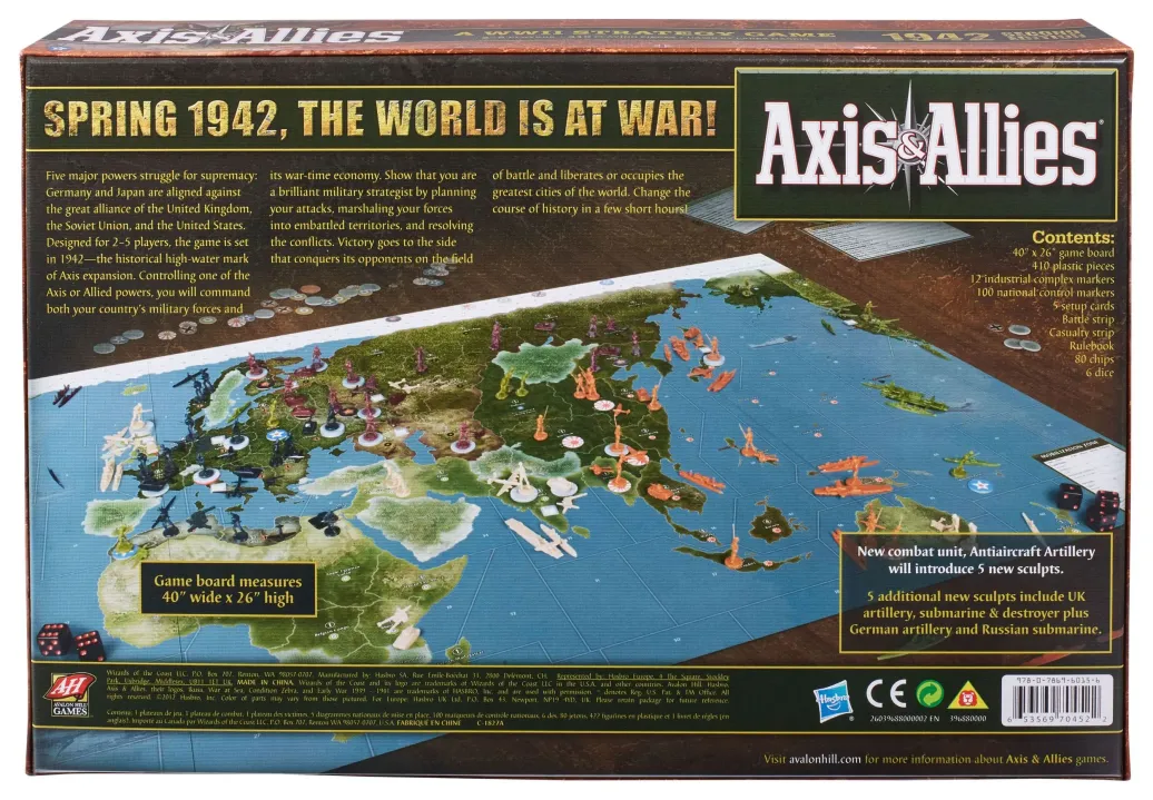 Dieses World War II Strategiespiel spielt im Jahr 1942, dem historischen Höhepunkt der Expansion der Achsenmächte. Sie steuern eine der Achsenmächte oder eine der alliierten Mächte und befehligen sowohl die Streitkräfte Ihres Landes als auch dessen Kriegswirtschaft. Sie haben die Möglichkeit, Angriffe zu planen, Streitkräfte in umkämpfte Gebiete zu bringen und Konflikte zu lösen. Der Sieg geht an die Seite, die ihre Gegner auf dem Schlachtfeld besiegt und die größten Städte der Welt befreit hat oder einnimmt. Diese zweite Ausgabe des Avalon Hill Brettspiels Axis & Allies 1942 enthält eine Flakartillerie-Kampfeinheit und Figuren, darunter britische Artillerie, U-Boot- und Zerstörer-Einheiten, deutsche Artillerie und ein russisches U-Boot. Das große Spielbrett misst 102 x 66 cm. Das Spiel ist für 2-5 Spieler ab 12 Jahren geeignet und die Spielzeit beträgt etwa 4 Stunden. Englische Ausgabe.