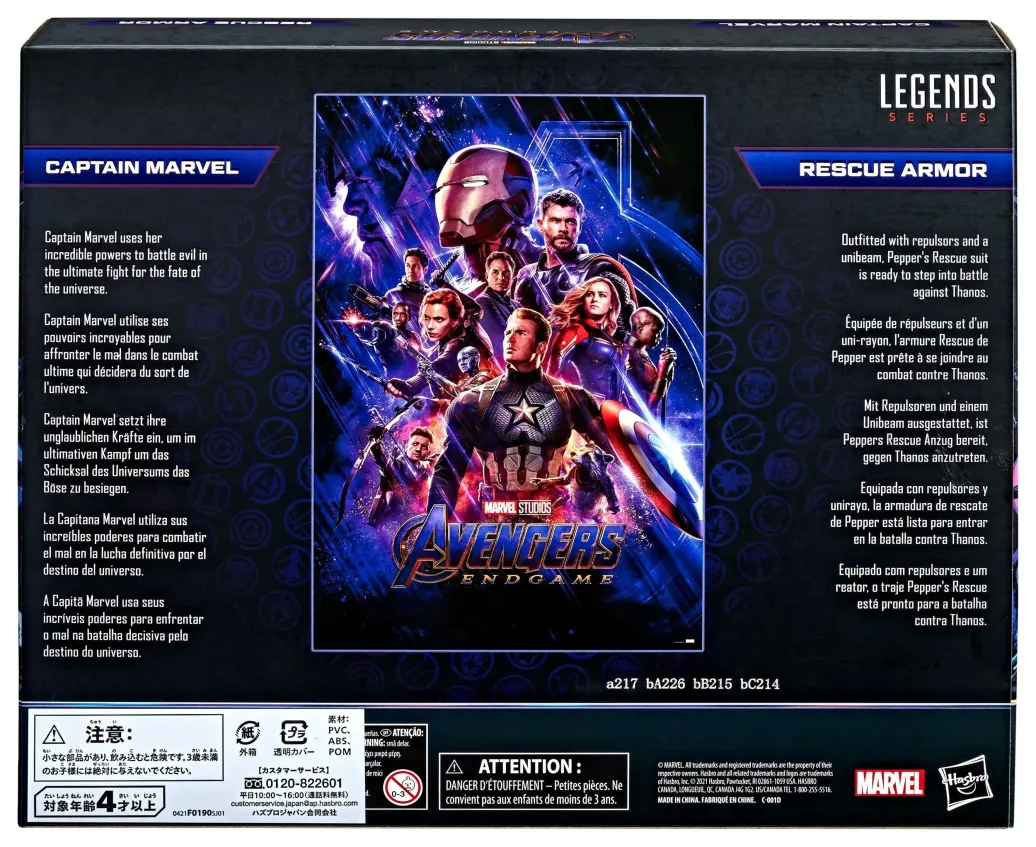 Captain Marvel setzt ihre unglaublichen Kräfte ein, um im ultimativen Kampf um das Schicksal des Universums das Böse zu besiegen. Mit Repulsoren und einem Unibeam ausgestattet, ist Peppers Rescue Anzug bereit, gegen Thanos anzutreten.