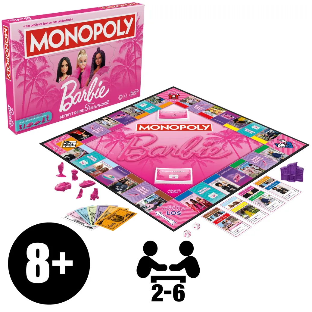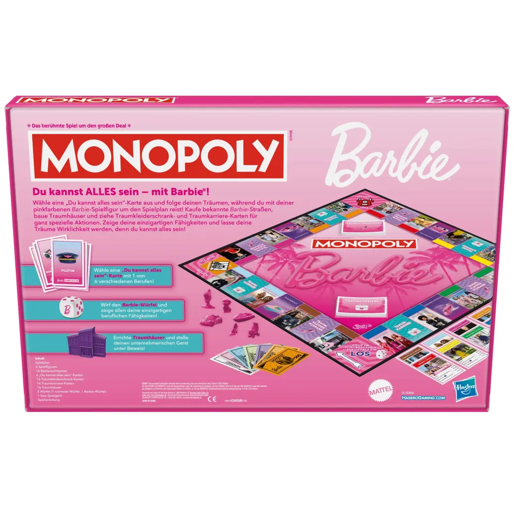 Mit Barbie können die Kids alles sein. Bei Monopoly Barbie schlüpfen die Spieler in Barbies pinkfarbene Schuhe, folgen ihren Träumen und verwirklichen sie. Zuerst wählt jeder Spieler mit einer "Du kannst alles sein"-Karte einen von 6 Barbie-Berufen. Dann reisen sie mit ihrer Barbie-Spielfigur um den Spielplan, um Straßen in ihrer Barbie-Traumwelt zu kaufen und Traumhäuser zu bauen! Wer mit dem Barbie-Würfel ein "B" wirft, entfesselt seine "Du kannst alles sein"-Fähigkeit und verschafft sich einen Vorteil. Mit Traumkarriere- und Traumkleiderschrank-Karten werden Berufs- und Modeträume wahr. Sogar berühmte Barbie-Fahrzeuge wie ihr Traummobil erscheinen auf den Traumfahrzeug-Feldern - es reist sich mit Stil! Geht ein Spieler bankrott, gewinnt derjenige mit dem meisten Geld! Das faszinierende Brettspiel eignet sich prima für Familien, Urlaub und mehr. Es ist ein mitreißendes Spiel für drinnen und toll als Geschenk für Familien und Kinder ab 8 Jahren, die Fans von Barbie Puppen und Monopoly sind.
