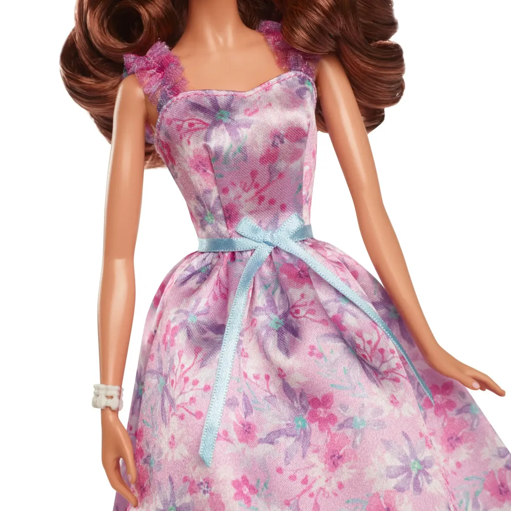 Barbie wünscht alles Gute zum Geburtstag! Diese Birthday Wishes Barbie-Puppe trägt ein seidiges Kleid mit Blumendruck und eignet sich perfekt für besondere Anlässe. Sie ist ein wunderbares Geburtstagsgeschenk. Die Packung umfasst ein extra Feld für eine schriftliche Widmung, die immer wieder gelesen werden kann und das Geschenk noch persönlicher macht. Diese Barbie ist hoffentlich ein Glücksbringer, damit alle Geburtstagswünsche wahr werden. Die Barbie-Puppe kann nicht von allein stehen. Abweichungen in Farbe und Gestaltung vorbehalten.