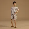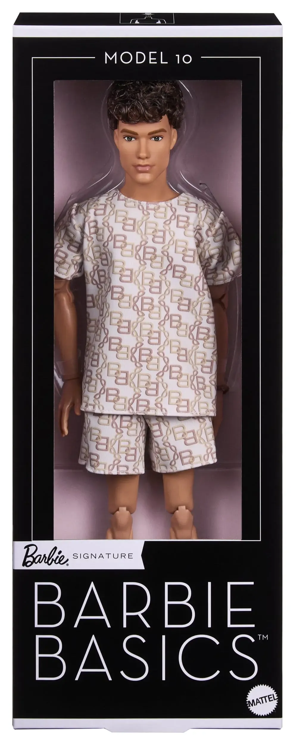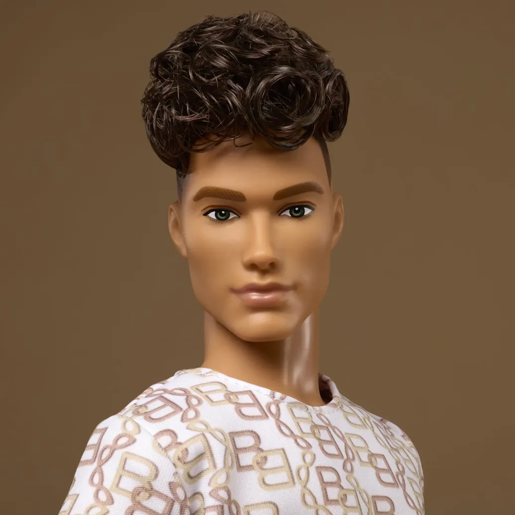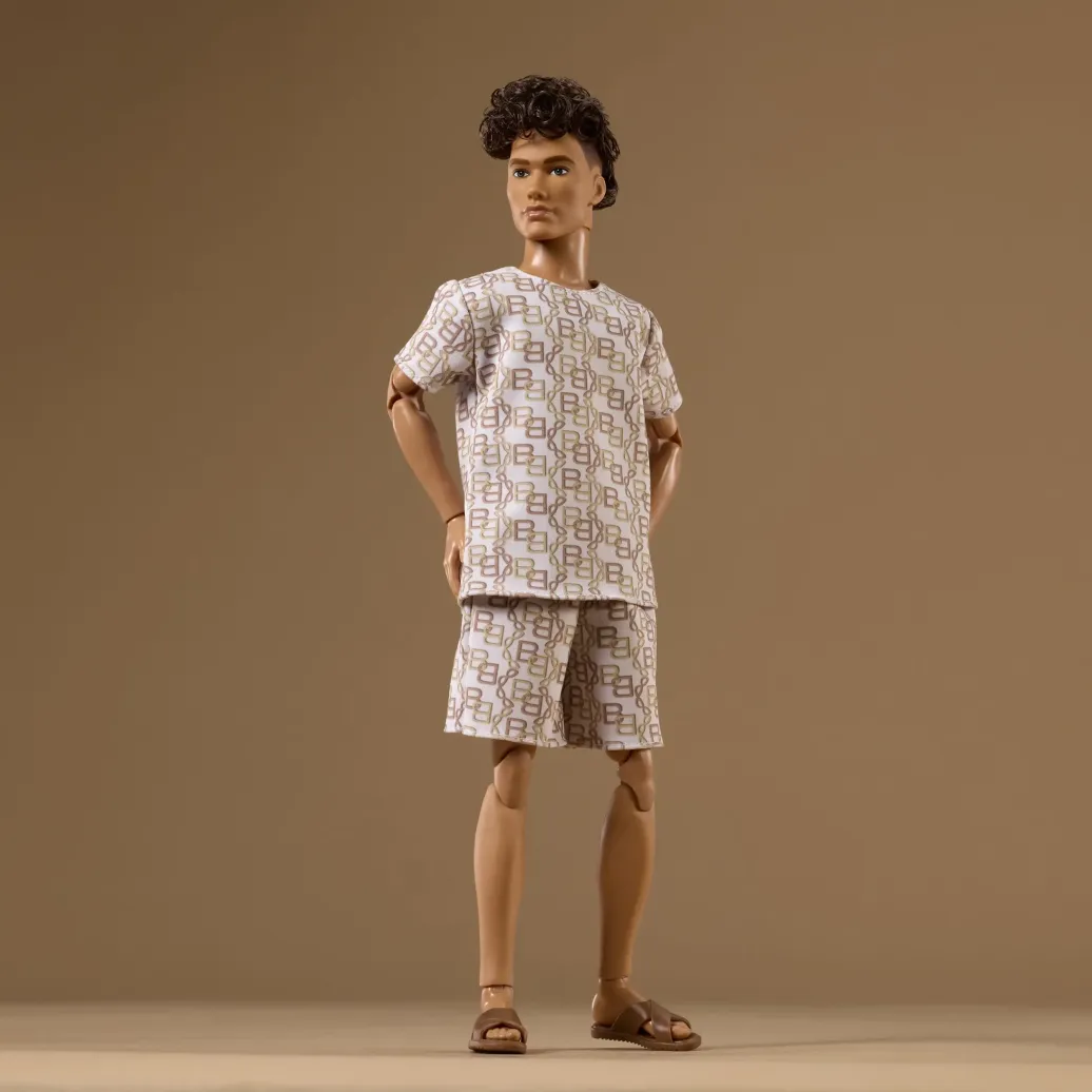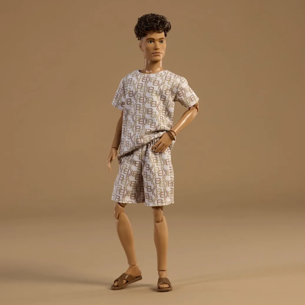 - Die Barbie Basics Model 10 Ken Puppe beherrscht den Monoprint-Look in T-Shirt und Shorts mit passendem, von Ketten inspiriertem Print und braunen Sandalen; sein brünettes Haar ist in einem coolen Long-Top-Schnitt gestylt.