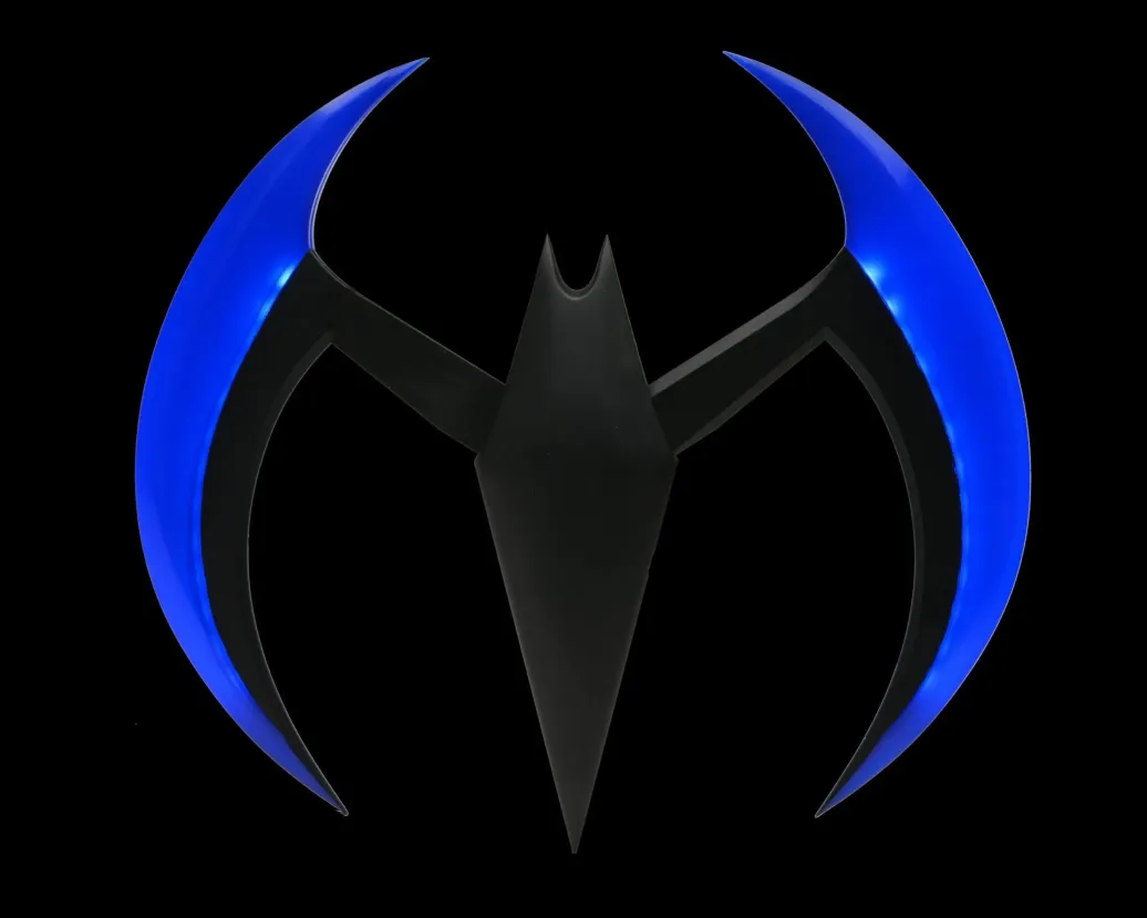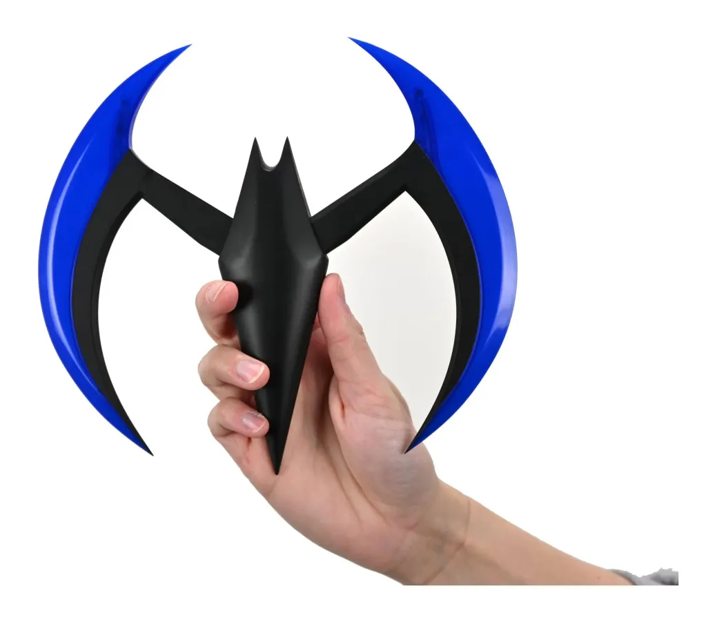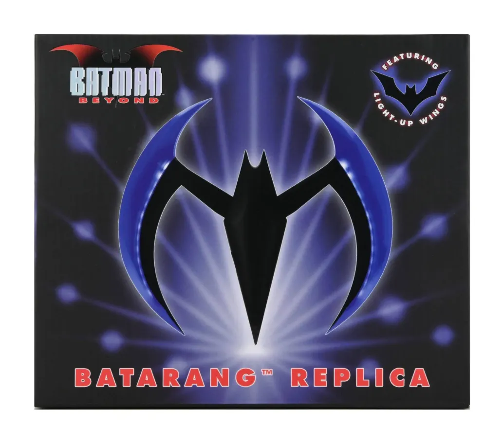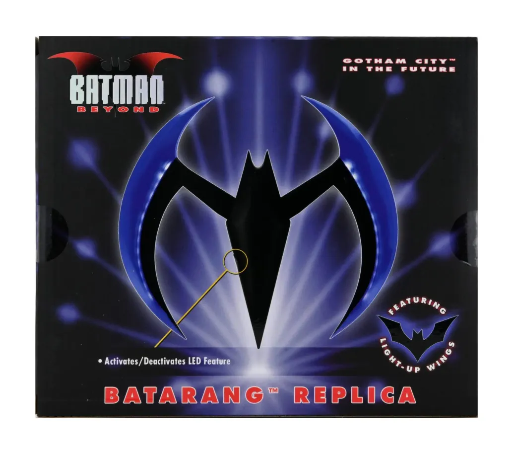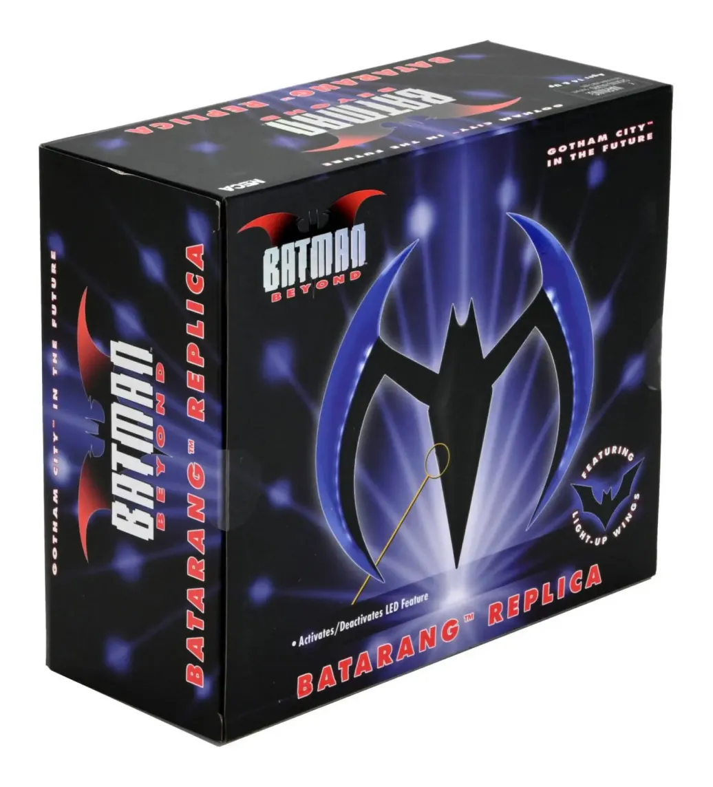 Zur animierten TV-Serie "Batman of the Future" (OT: Batman Beyond) kommt diese offiziell lizenzierte und originalgetreute Nachbildung von Batmans Batarang. Er ist ca. 20 cm breit, verfügt über eine Leuchtfunktion und wird in einem bedruckten Karton geliefert.