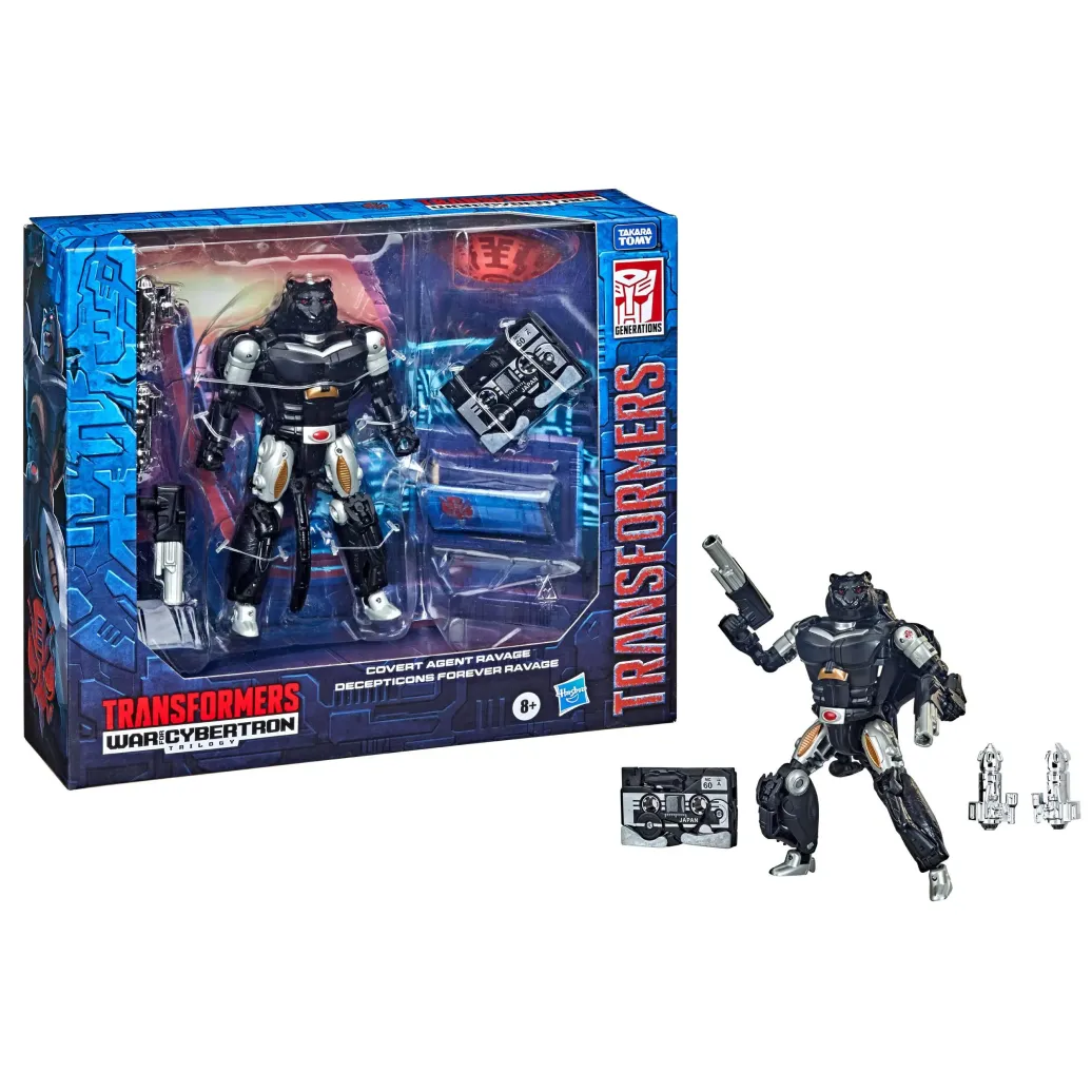 Dieser Pack enthält 2 Versionen der Ravage Figur aus der kultigen Szene: Covert Agent Ravage und Decepticons Forever Ravage mit 2 Pistolen und 2 Battle-Effekten. Die Covert Agent Ravage Figur kann in 20 Schritten vom Roboter in einen Jaguar verwandelt werden. Die Decepticons Forever Ravage Figur lässt sich in 4 Schritten vom Jaguar in eine Mini-Kassette verwandeln und kommt mit durch G1 inspirierten Stickern zum Dekorieren der Kassette. Die Fans werden eingeladen, die Figuren mit durch die Kommandozentrale des von Ravage kommandierten Transwarp Cruisers inspirierter Verpackung in der Szene zu präsentieren.