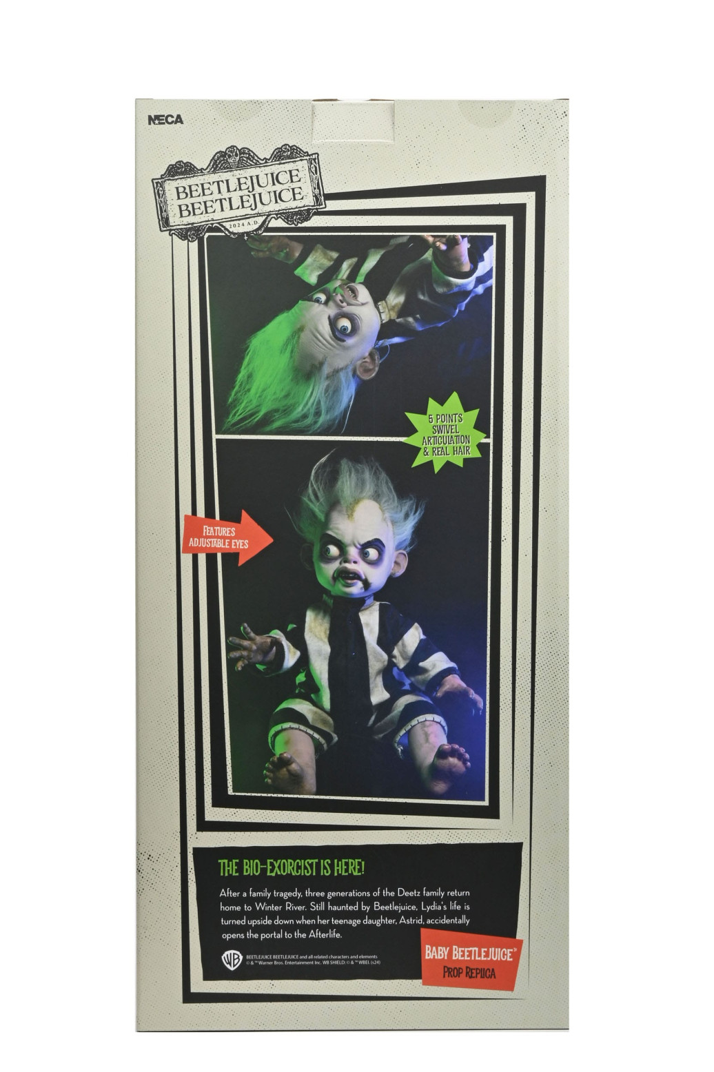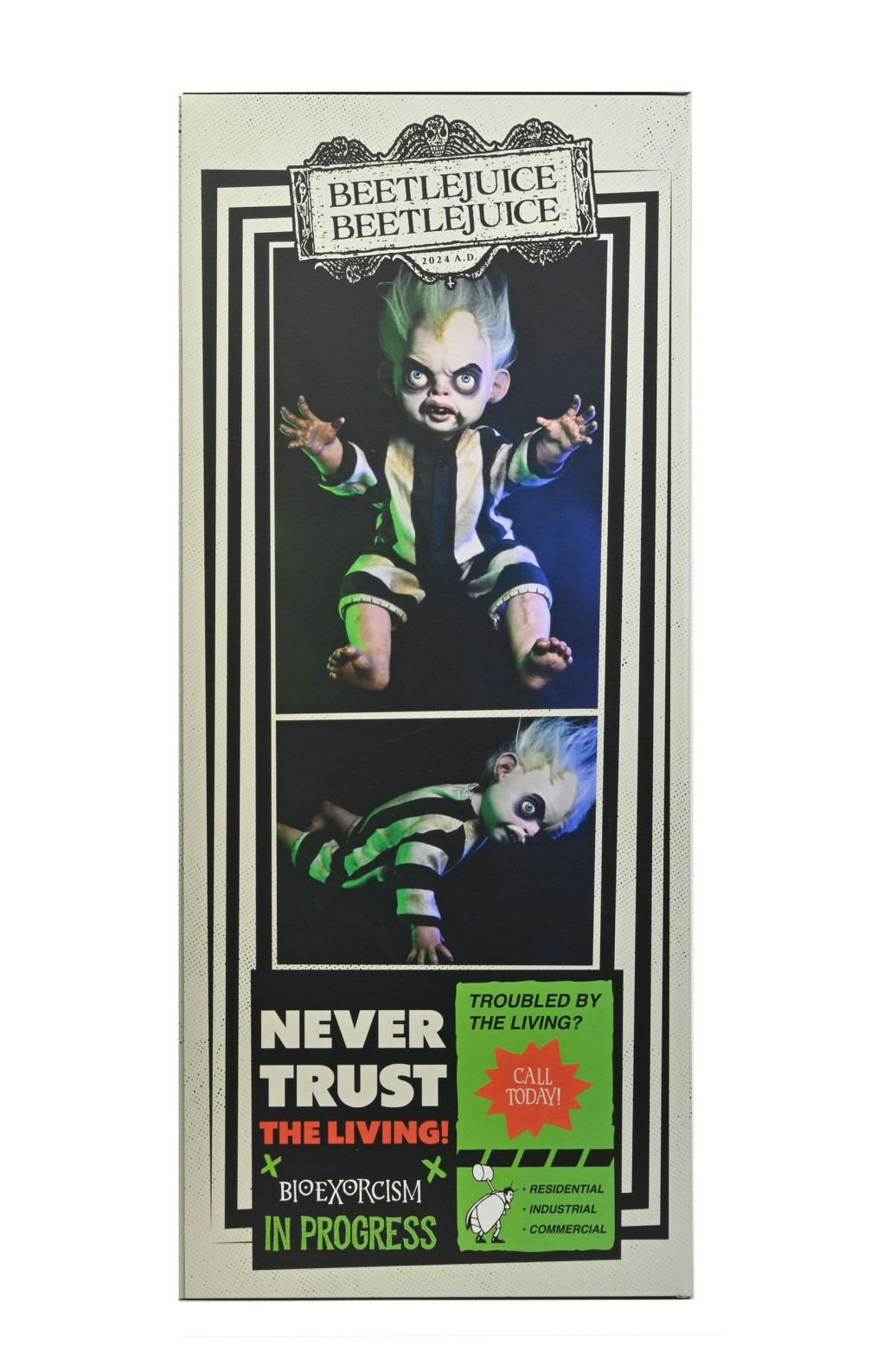 Zur Horrorkomödie "Beetlejuice Beetlejuice" kommt diese offiziell lizenzierte und originalgetreute Nachbildung der Baby Beetlejuice Puppe. Sie ist ca. 49 cm groß und wird in einer bedruckten Fensterbox geliefert.