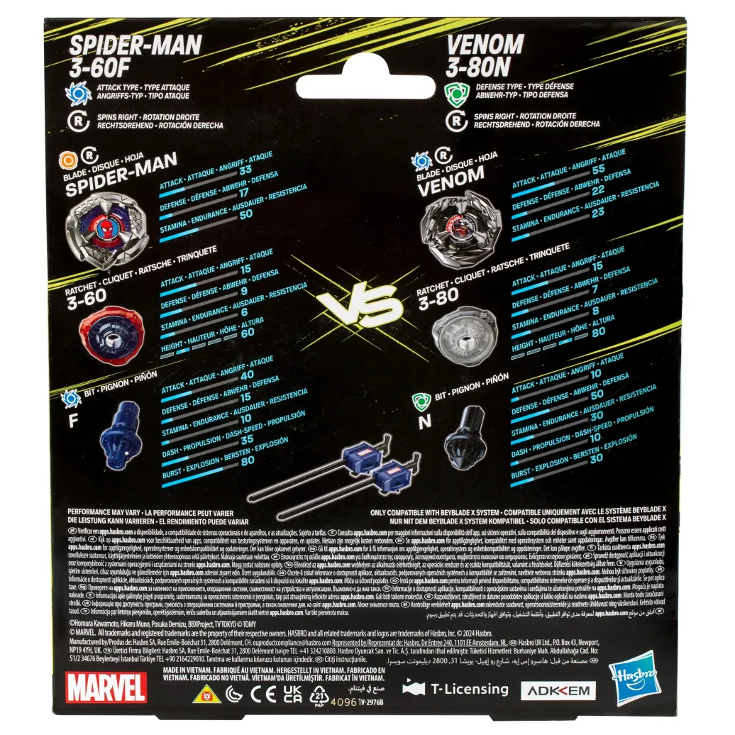 Die nächste Generation von Beyblade Stadium-Arenen, Startern und Kreiseln: Beyblade X. Der Beyblade X Marvel Collab Spider-Man 3-60F und Venom 3-80N Multipack enthält 2 rechtsdrehende Kreisel und 2 Starter. (Beystadium-Arena erforderlich). Mit dem Marvel Collab Multipack können Beyblade Fans direkt ins Battle starten oder die austauschbaren Teile der Kreisel (Blade, Ratsche und Bit) gegen die Teile von anderen Beyblade X Kreiseln (separat erhältlich) tauschen, um ihren eigenen Kreisel zu erschaffen. Beyblade X wartet mit dem X-Celerator Beschleunigungssystem auf. Wenn das Zahnrad eines Beyblade X Kreisels in der Schiene der Beystadium-Arena einrastet, kommt es zu einer Super-Beschleunigung (Xtreme Dash), bei der der Kreisel durch die Arena geschleudert wird. Hier können sich Blader ins Battle stürzen und Punkte erzielen. Wer zuerst 4 Punkte hat, gewinnt. Hasbro Beyblade Kreisel mit authentischen Takara Tomy Teilen aus Metall eignen sich hervorragend als Geschenk für Kinder ab 8 Jahren.