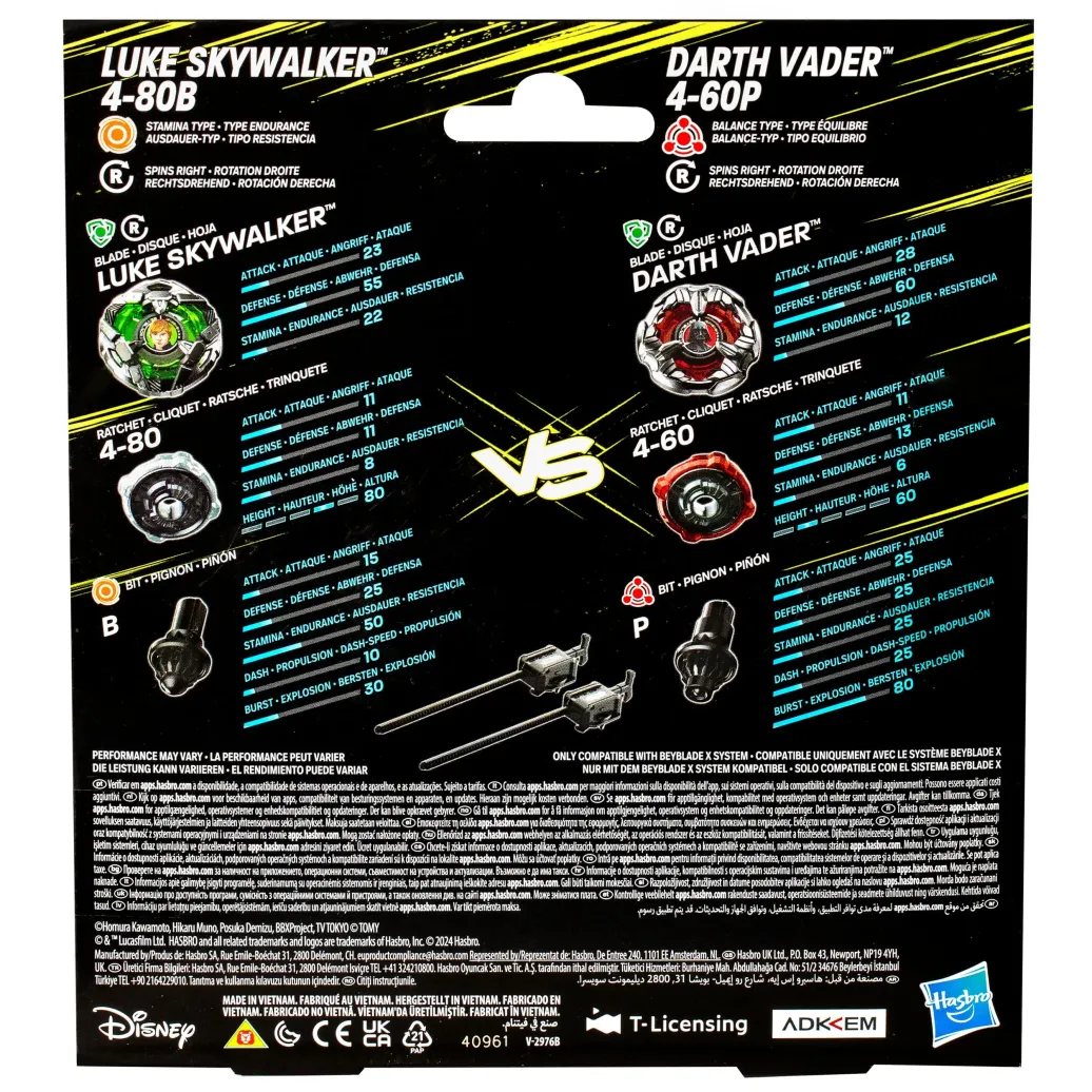 Die nächste Generation von Beyblade Stadium-Arenen, Startern und Kreiseln: Beyblade X. Der Beyblade X und Star Wars Collab Luke Skywalker 4-80B und Darth Vader 4-60B Multipack enthält 2 rechtsdrehende Kreisel und 2 Starter. (Beystadium-Arena erforderlich). Mit dem Star Wars Collab Multipack können Beyblade Fans direkt ins Battle starten oder die austauschbaren Teile der Kreisel (Blade, Ratsche und Bit) gegen die Teile von anderen Beyblade X Kreiseln (separat erhältlich) tauschen, um ihren eigenen Kreisel zu erschaffen. Beyblade X wartet mit dem X-Celerator Beschleunigungssystem auf. Wenn das Zahnrad eines Beyblade X Kreisels in der Schiene der Beystadium-Arena einrastet, kommt es zu einer Super-Beschleunigung (Xtreme Dash), bei der der Kreisel durch die Arena geschleudert wird. Hier können sich Blader ins Battle stürzen und Punkte erzielen. Wer zuerst 4 Punkte hat, gewinnt. Hasbro Beyblade Kreisel mit authentischen Takara Tomy Teilen aus Metall eignen sich hervorragend als Geschenk für Kinder ab 8 Jahren.