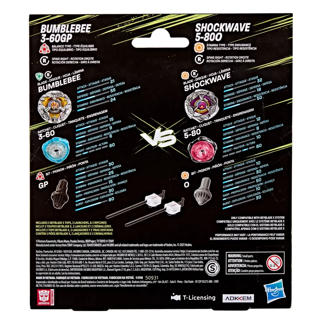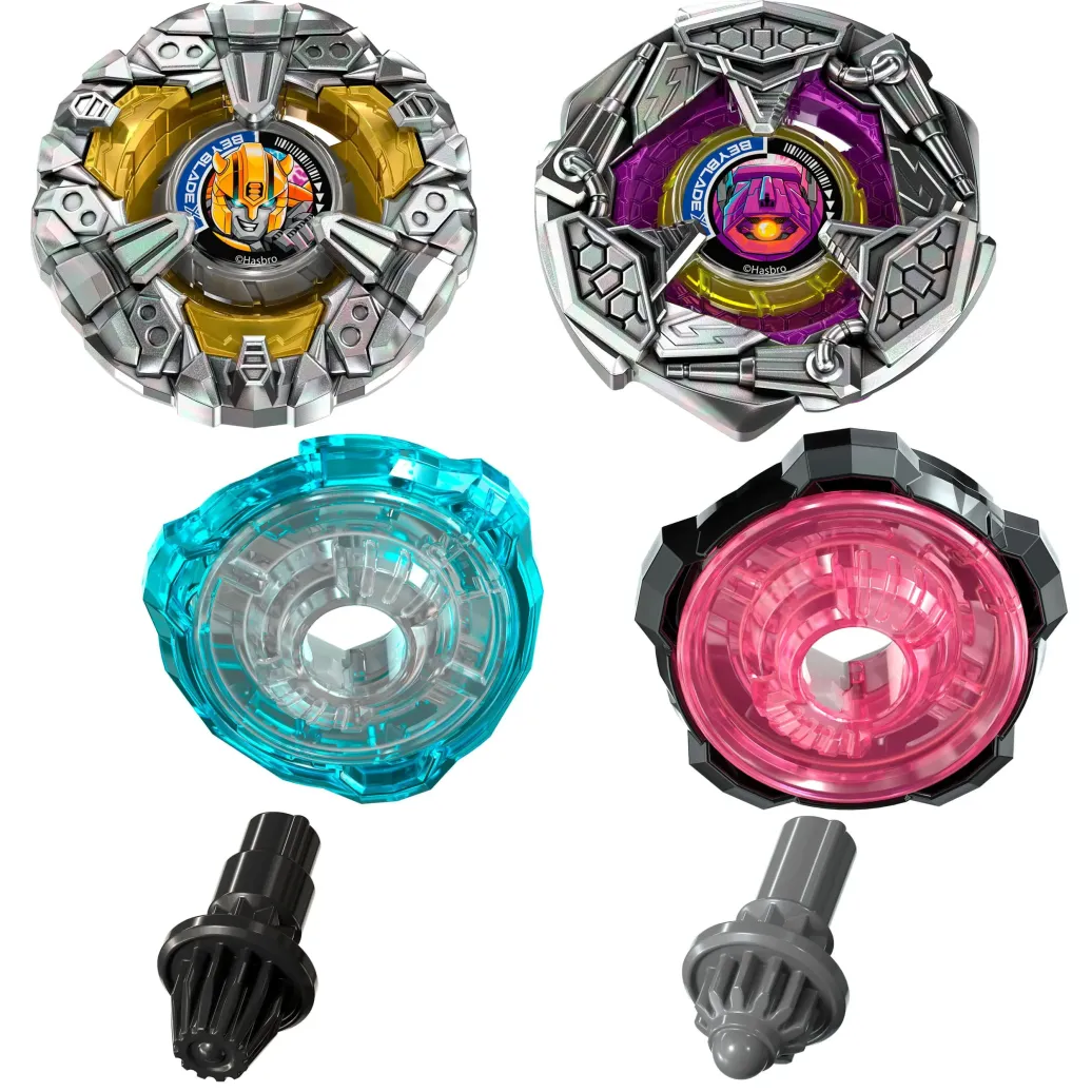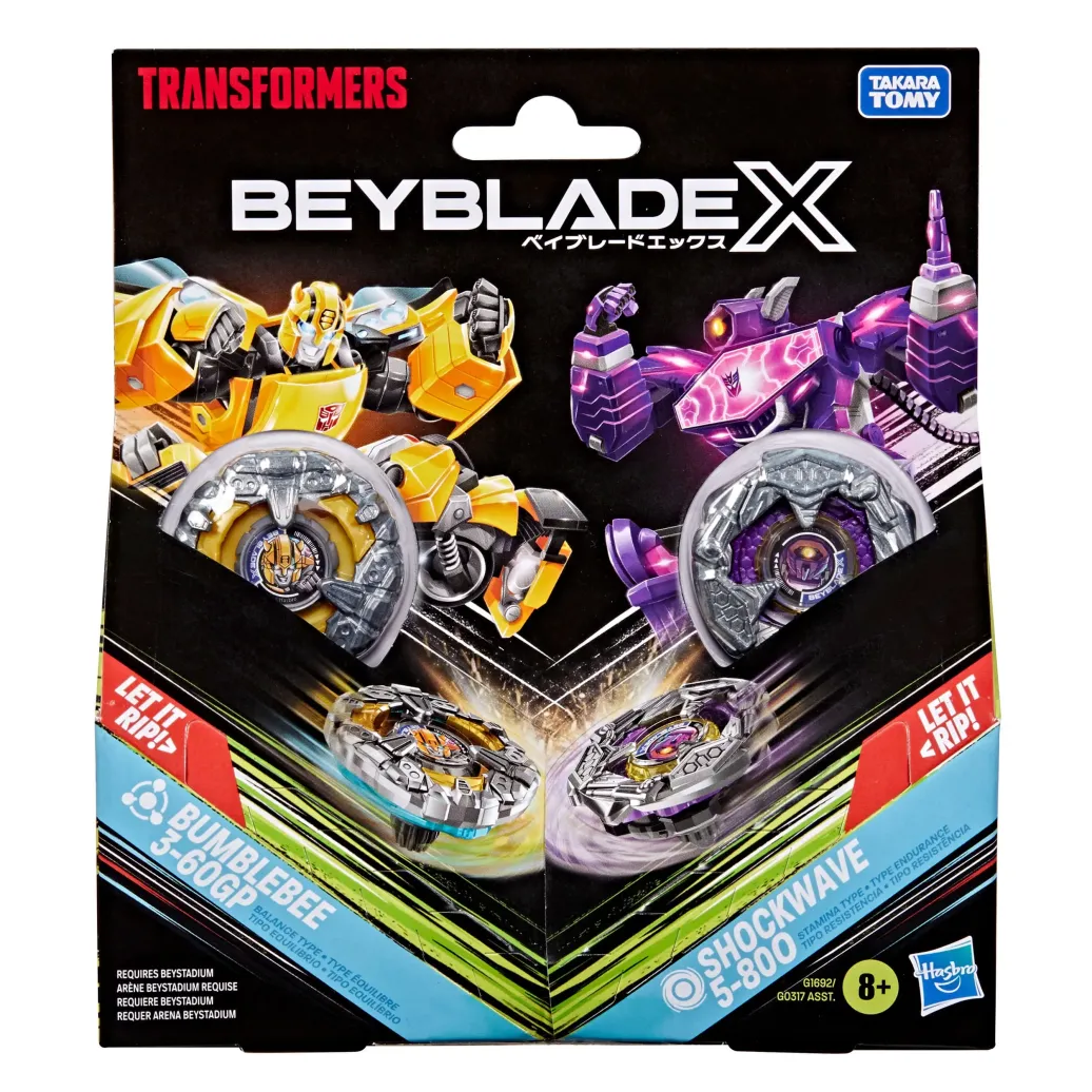 Die nächste Generation von Beyblade Stadium-Arenen, Startern und Kreiseln: Beyblade X. Der Beyblade X und Transformers Multipack enthält 2 rechtsdrehende Kreisel - Bumblebee 3-60GP vs. Shockwave 5-80O - sowie 2 Starter (Beystadium-Arena erforderlich, separat erhältlich). Mit dem Transformers Collab Multipack können Beyblade Fans direkt in den Kampf starten oder die austauschbaren Teile der Kreisel (Blade, Ratsche und Bit) gegen die Teile von anderen Beyblade X Kreiseln (separat erhältlich) tauschen, um den eigenen, perfekten Beyblade Kreisel zu erschaffen. Beyblade X verfügt über das X-Celerator Beschleunigungssystem, mit dem das Spiel auf das nächste Level gebracht wird. Wenn das Zahnrad eines Beyblade X Kreisels in der Schiene der Beystadium-Arena einrastet, kommt es zu einer Super-Beschleunigung (Xtreme Dash), bei der der Kreisel durch die Arena geschleudert wird. Hier können sich Blader ins Battle stürzen und Punkte erzielen. Wer zuerst 4 Punkte hat, gewinnt. Hasbro Beyblade Kreisel mit authentischen Takara Tomy Teilen aus Metall eignen sich hervorragend als Geschenk für Jungen und Mädchen ab 8 Jahren.