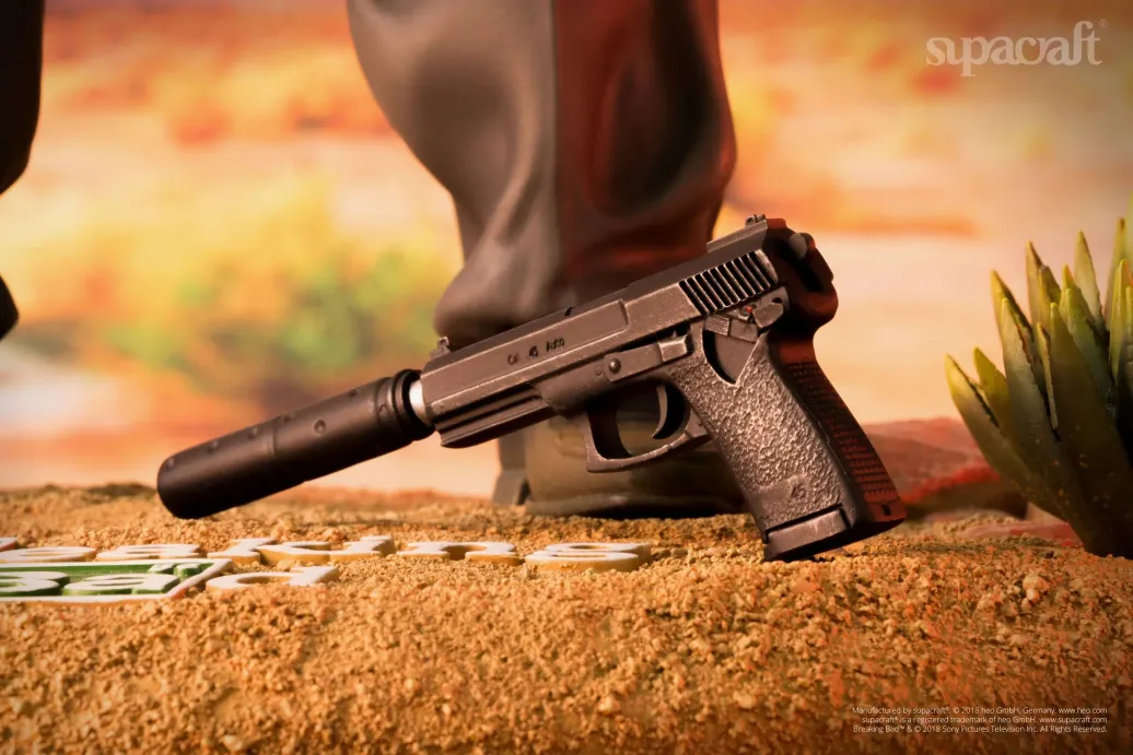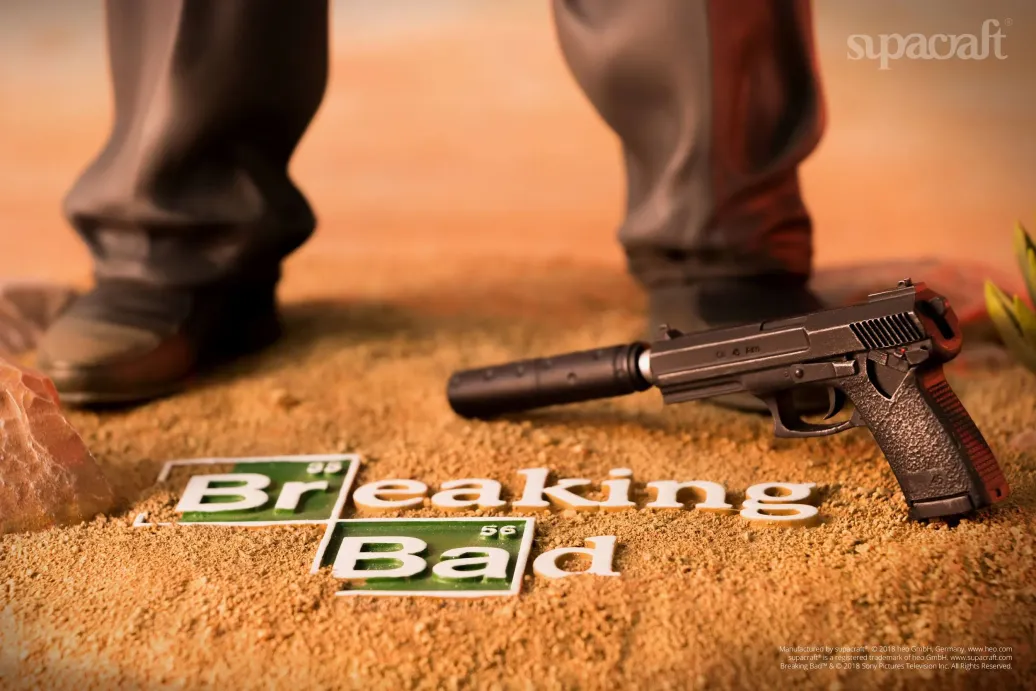 Die Statue verfügt über unglaubliche Details und hält sich strikt an Mikes Aussehen in der Serie. Die Verwendung von transluzentem Resin lässt seine Haut fast unheimlich lebensecht erscheinen und jede einzelne Vene, Falte und Haarstoppel sitzt an der richtigen Stelle. Die Statue ist Schauspieler Jonathan Banks wie aus dem Gesicht geschnitten und in der für Mike typischen ruhigen und selbstsicheren Pose lässt sie keine Wünsche offen. Mit dabei ist eine detailgetreue Nachbildung von Mikes HK MK23 Pistole mit Schalldämpfer. Die Base im New Mexico Wüsten-Look mit staubigen Kakteen, Steinen und einem teils mit Sand bedeckten, drei-dimensionalen Breaking Bad™-Logo überzeugt ebenfalls durch zahlreicheh Details. Die Oberfläche wirkt dermaßen realistisch, dass man sich beim Versuch ertappt, die Sandkörner wegzupusten. Es wurde sogar darauf geachtet, dass die dargestellten Pflanzen der Region entsprechen.