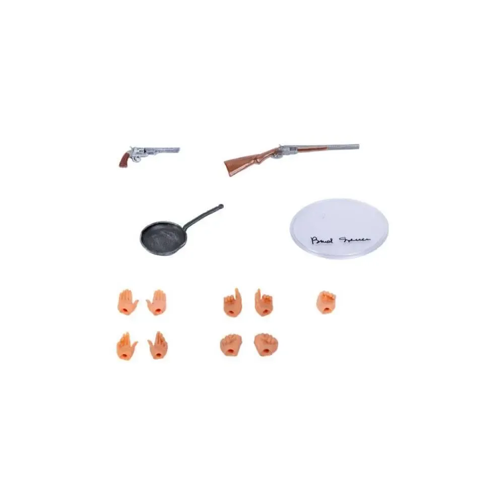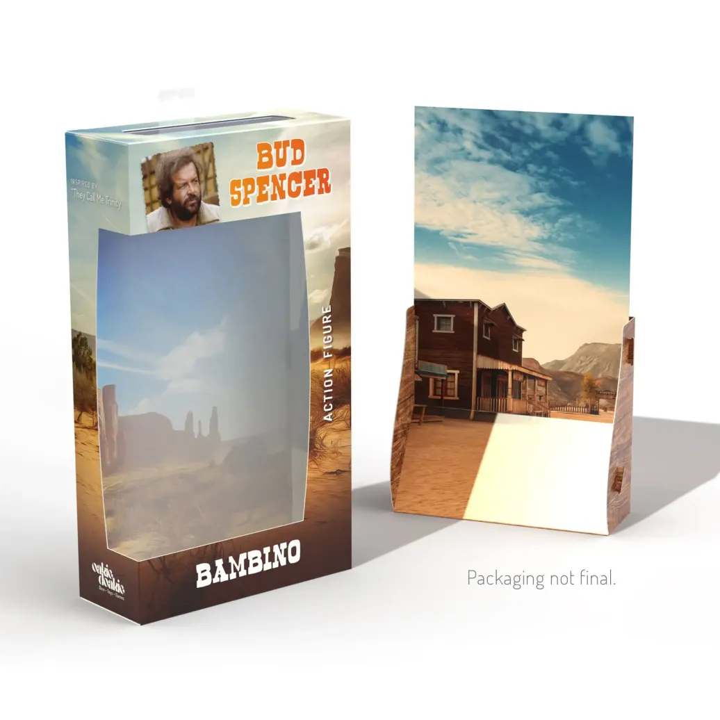 Die offiziell lizenzierte Actionfigur von Bud Spencer wurde inspiriert durch seine Rolle als Bambino (Der Kleine) aus dem Klassiker Die rechte und die linke Hand des Teufels. Die 18 cm große Figur verfügt über 14 Bewegungspunkte und wird mit weiterem Zubehör in einer Fensterbox mit Hänger geliefert. Ein transparenter Standfuß mit aufgedruckter Signatur verhilft Bambino zu einem sicheren Stand und ein wendbares, beidseitig bedrucktes Diorama sorgt für eine ansprechende Präsentation der Figur, wahlweise vor Wüsten- oder Westernstadt-Hintergrund.