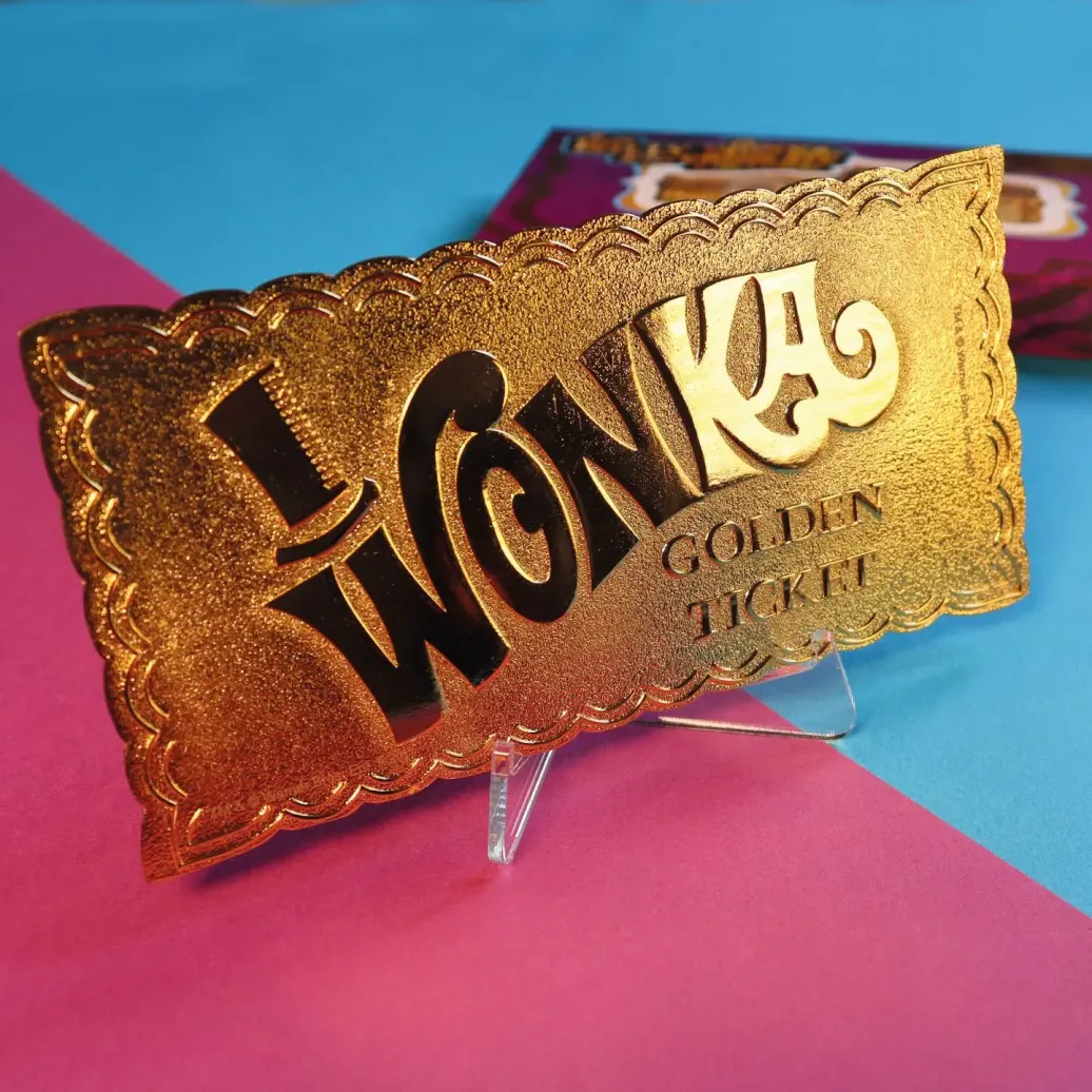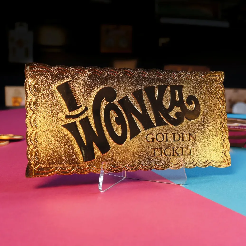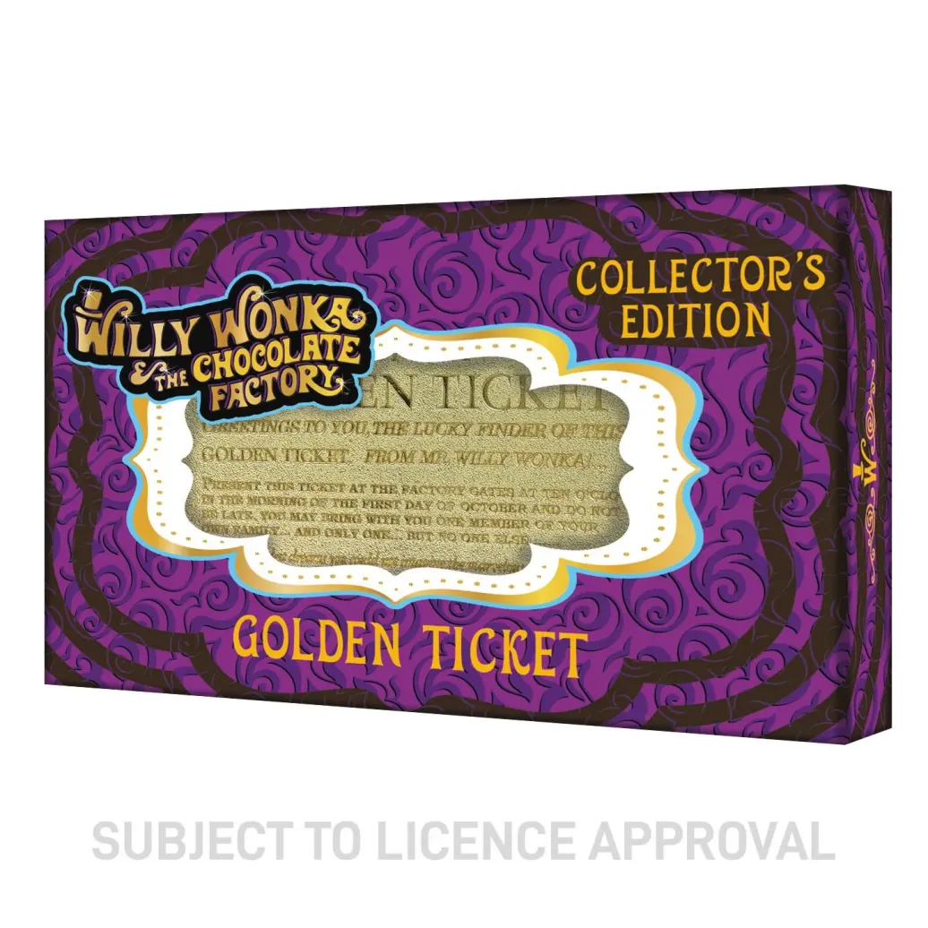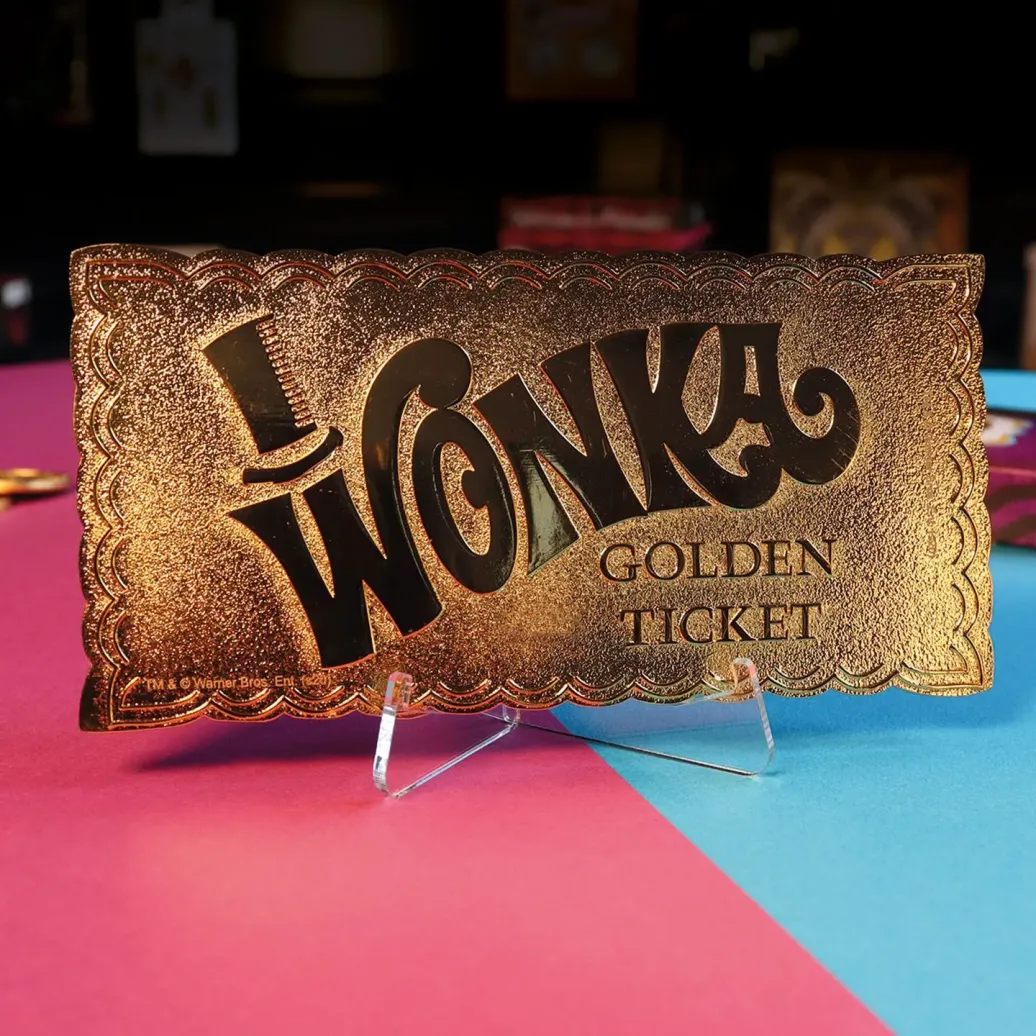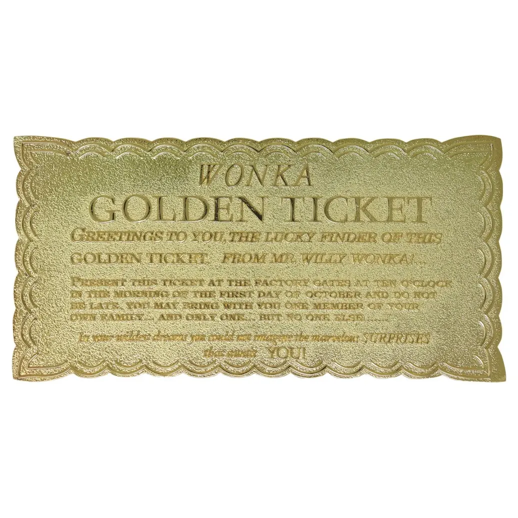 Offiziell lizenzierte Nachbildung eines goldenen Tickets aus "Charlie und die Schokoladenfabrik". Das Ticket ist ca. 90 x 45 mm groß und weltweit auf 5000 Stück limitiert.