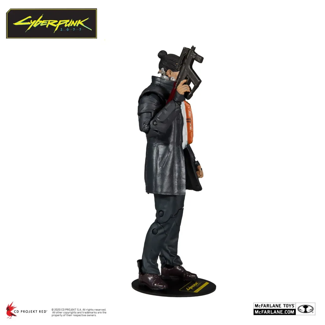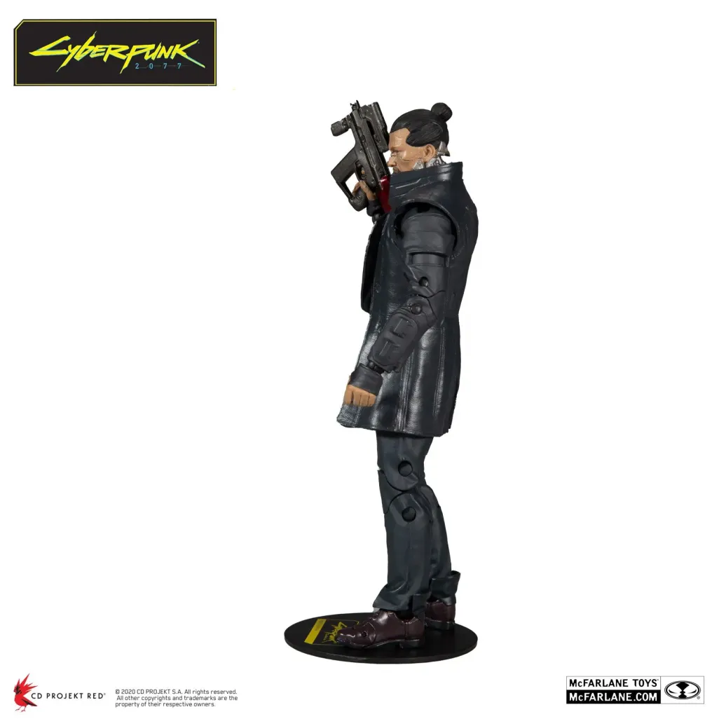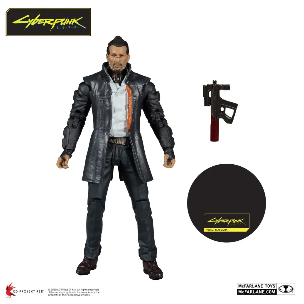 Zum Videospiel Cyberpunk 2077 kommt diese detailreiche, bewegliche Takemura Actionfigur. Sie ist ca. 18 cm groß und wird mit weiterem Zubehör und Base in einer bedruckten Fensterbox geliefert.