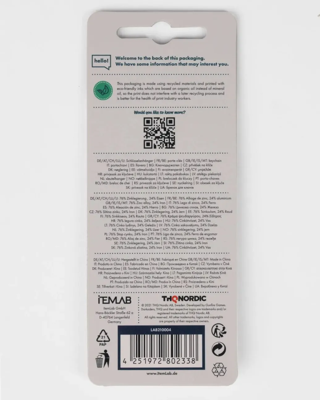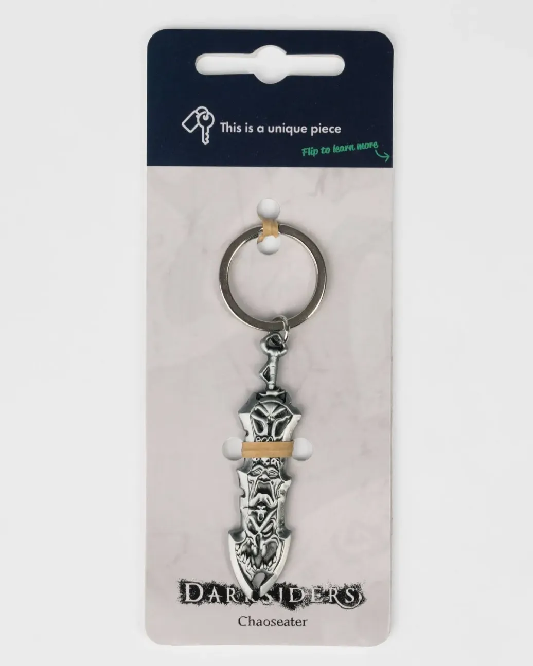 Hochwertiger Schlüsselanhänger zum Darksiders-Franchise von THQ Nordic. Der Schlüsselanhänger misst 8cm in der Länge und zeigt Wars mächtigstes Schwert Chaoseater, welches seit dem ersten Darksiders Titel sein treuer Begleiter ist. Der präzise und detailgetreue Schlüsselanhänger ist aus gebürstetem Metall hergestellt. Mache es zu deiner Aufgabe, mit den vier Apokalyptischen Reitern das Gleichgewicht zwischen Himmel und Hölle zu wahren. Der nachhaltig produzierte Schlüsselanhänger besteht aus 100% recyceltem, nickelfreiem Metall und ist damit auch für Allergiker geeignet. Die aus 100% recyceltem Altpapier produzierte Blisterkarte ist mit umweltfreundlichen Farben bedruckt, welche eine stoffliche Verwertung der Verpackung nicht behindern und so ein echtes Recycling und eine Wiederverwendung der Rohstoffe ermöglichen.