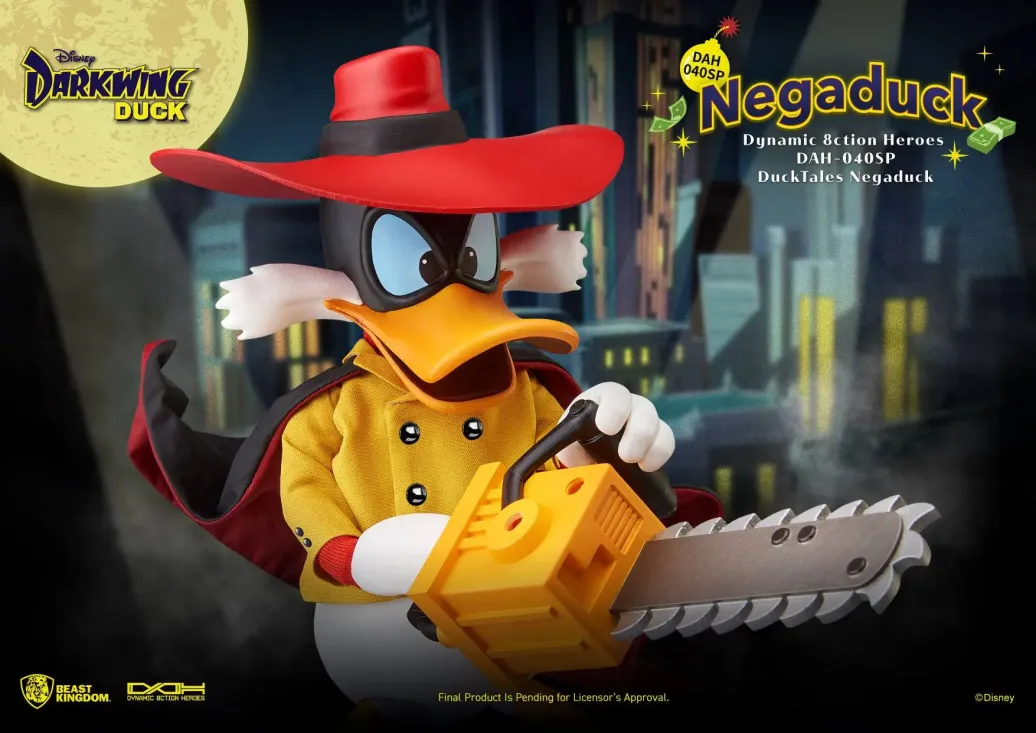 Zur Zeichentrickserie Darkwing Duck kommt diese großartige Actionfigur aus der Dynamic 8ction Heroes Serie von Beast Kingdom Toys. Sie ist ca. 16 cm groß und wird mit weiteren Austausch- und Zubehörteilen in einer bedruckten Box geliefert.