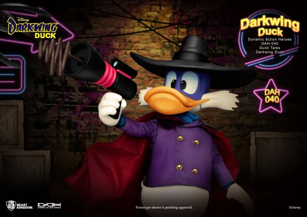 Zur Zeichentrickserie Darkwing Duck kommt diese großartige Darkwing Duck Actionfigur aus der Dynamic 8ction Heroes Serie von Beast Kingdom Toys. Sie ist ca. 16 cm groß und wird mit weiteren Austausch- und Zubehörteilen in einer bedruckten Box geliefert.
