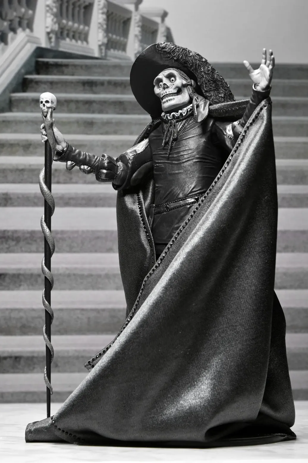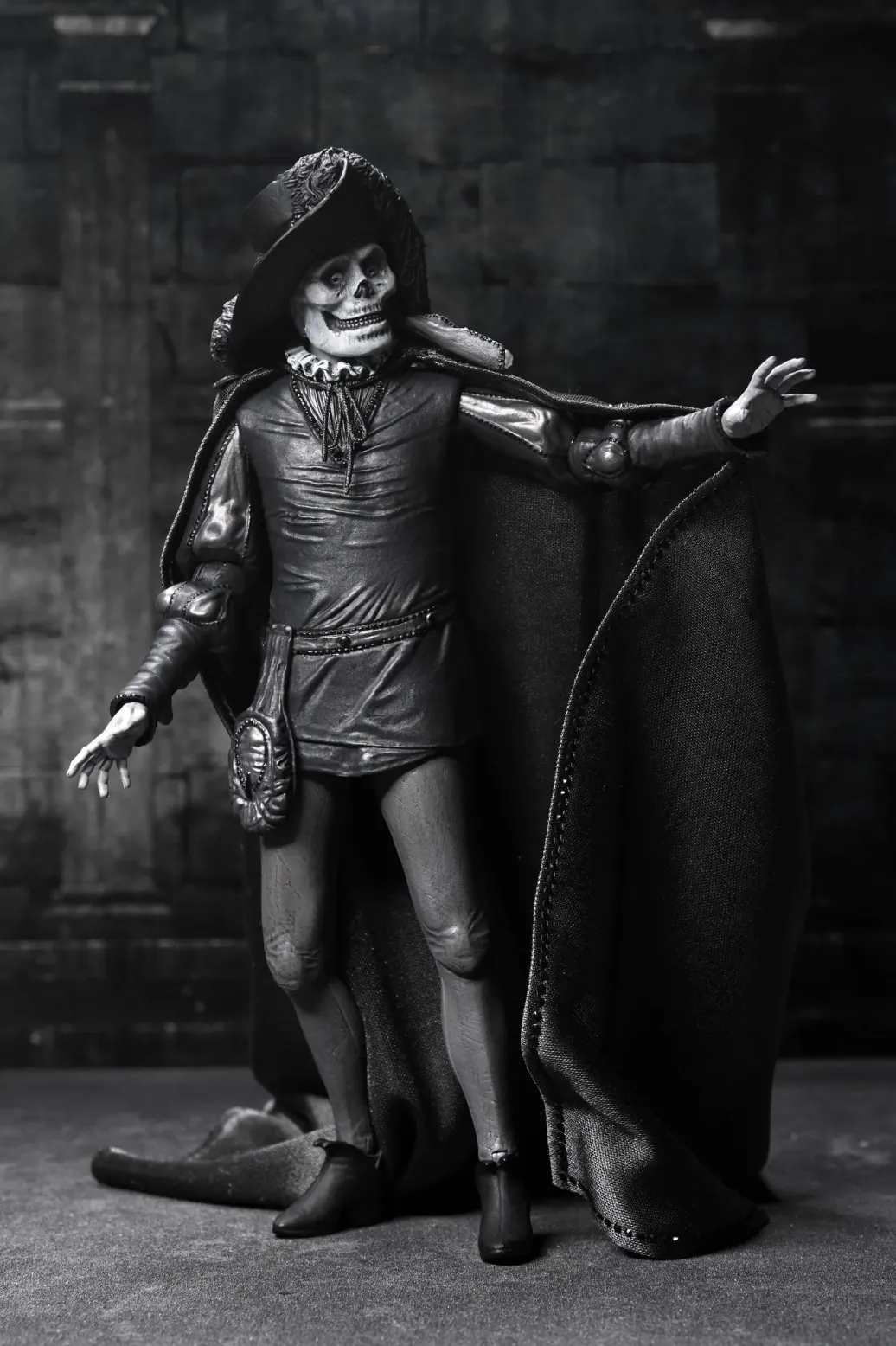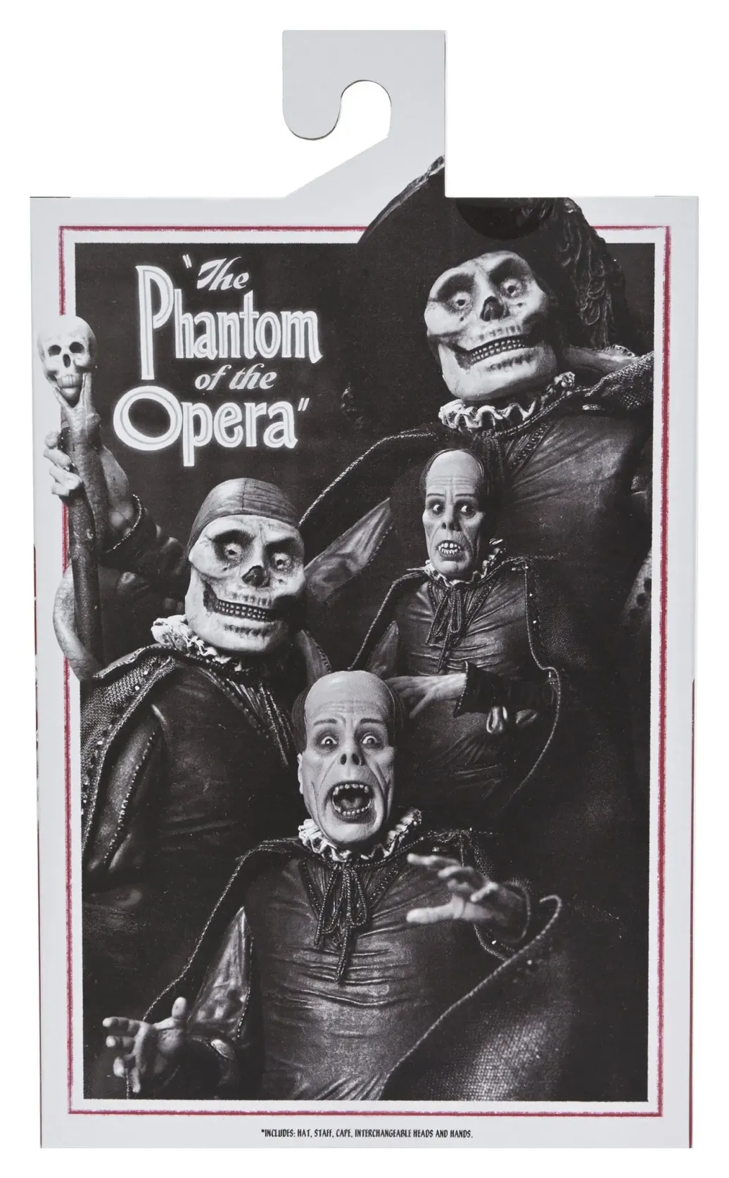 Feiern Sie über ein Jahrhundert Kinohorror! Markieren Sie den 101. Jahrestag des Stummfilms Das Phantom der Oper von 1925 mit dieser atemberaubenden Actionfigur in klassischem Schwarz-Weiß von NECA. Als wäre er gerade der Leinwand entstiegen, fängt diese 7-Zoll-Figur des Phantoms (Erik) in seiner ikonischen "Roter Tod"-Verkleidung vom Maskenball die eindringliche Eleganz von Lon Chaneys klassischer Darstellung ein. Sein entstelltes Gesicht unter der Schädelmaske verbergend, spioniert er Christine und Raoul auf dem Dach der Pariser Oper aus. Dieses Sammlerstück enthält einen Stoffumhang, einen Hut mit breiter Krempe und einen Schädelstab als Zubehör. Außerdem mehrere Köpfe und Hände, die mit anderen NECA Phantom der Oper-Figuren (separat erhältlich) austauschbar sind. Präsentiert in einer sammlerfreundlichen Box mit aufklappbarer Frontklappe, ist diese Figur ein Muss für Horrorfans und Sammler klassischer Filme! Größe: 17,8 cm