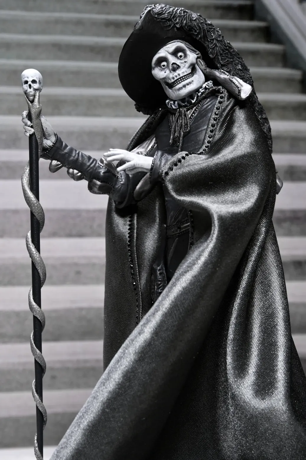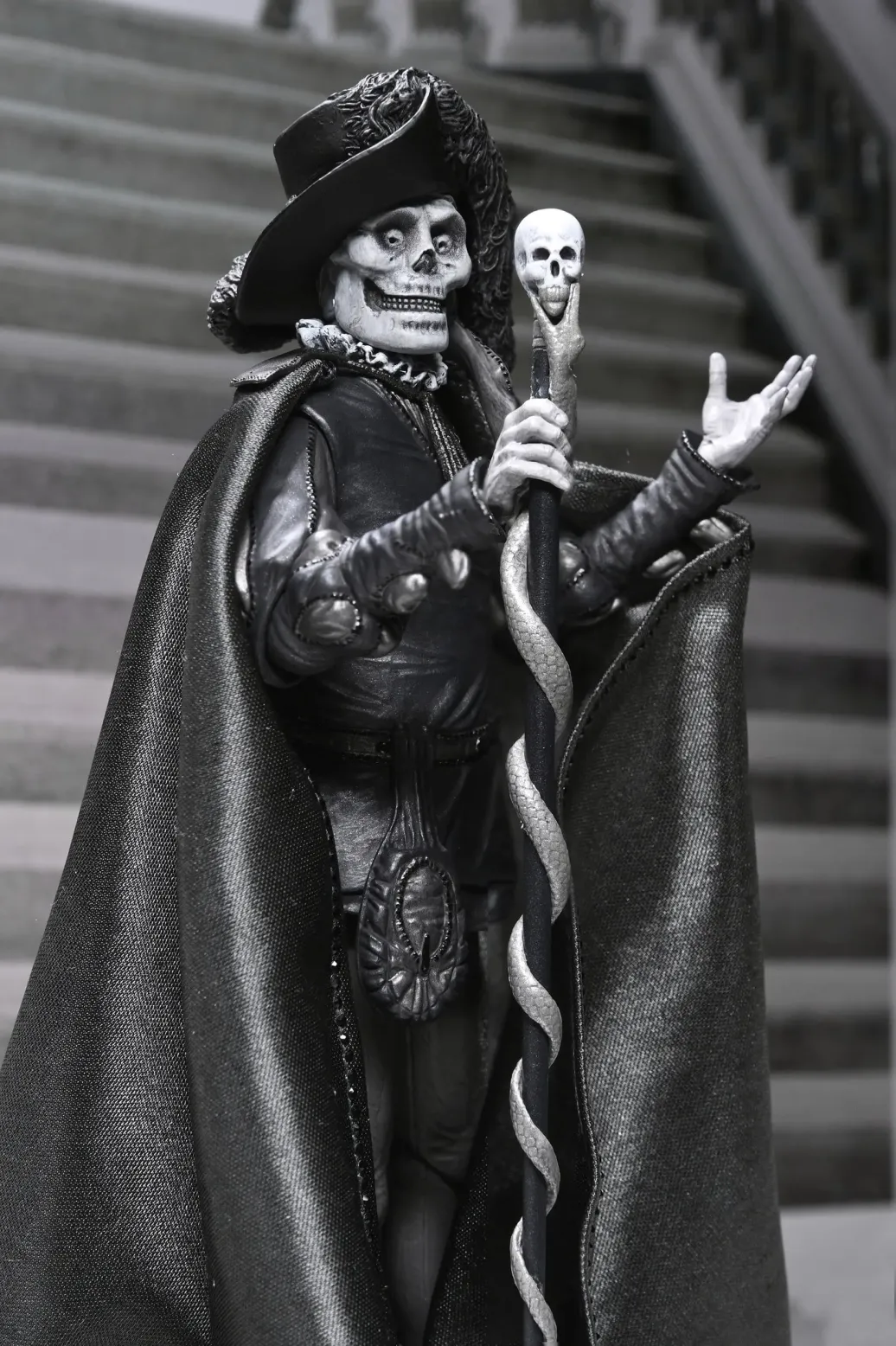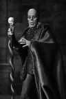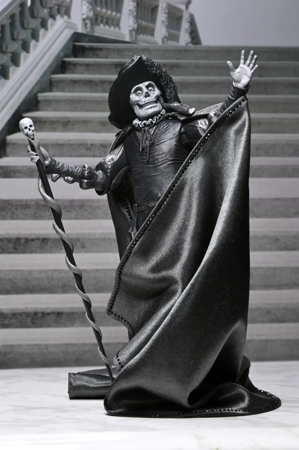Feiern Sie über ein Jahrhundert Kinohorror! Markieren Sie den 101. Jahrestag des Stummfilms Das Phantom der Oper von 1925 mit dieser atemberaubenden Actionfigur in klassischem Schwarz-Weiß von NECA. Als wäre er gerade der Leinwand entstiegen, fängt diese 7-Zoll-Figur des Phantoms (Erik) in seiner ikonischen "Roter Tod"-Verkleidung vom Maskenball die eindringliche Eleganz von Lon Chaneys klassischer Darstellung ein. Sein entstelltes Gesicht unter der Schädelmaske verbergend, spioniert er Christine und Raoul auf dem Dach der Pariser Oper aus. Dieses Sammlerstück enthält einen Stoffumhang, einen Hut mit breiter Krempe und einen Schädelstab als Zubehör. Außerdem mehrere Köpfe und Hände, die mit anderen NECA Phantom der Oper-Figuren (separat erhältlich) austauschbar sind. Präsentiert in einer sammlerfreundlichen Box mit aufklappbarer Frontklappe, ist diese Figur ein Muss für Horrorfans und Sammler klassischer Filme! Größe: 17,8 cm