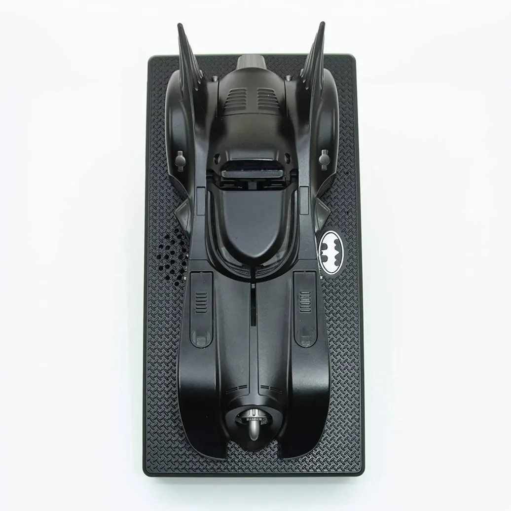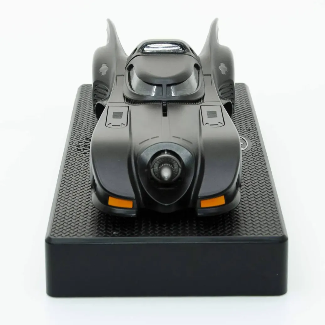 - ELEGANTES STÜCK FÜR SAMMLER. Das elegante, aus Diecast gefertigte Auto steht auf einem schwarzen Sockel mit einem kleinen Bat-Emblem auf der Vorderseite. Es verfügt über eine zugängliche Motorhaube, ein aufklappbares Cockpit und klappbare, seitlich montierte Waffen.