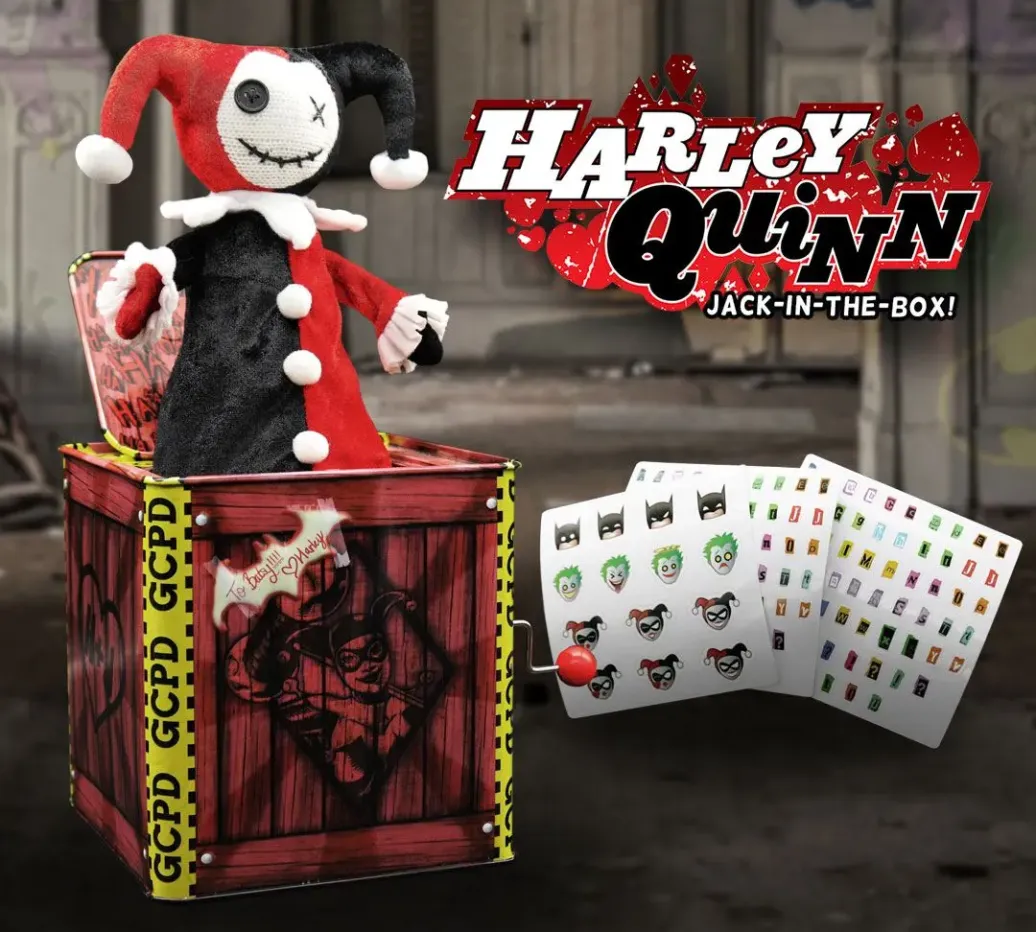 Zu DC Comics kommt diese wunderschöne Harley Quinn Springteufel Spieluhr. Man dreht an der Handkurbel um am Ende springt Harley Quinn aus der Schachtel.