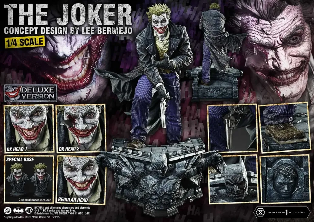 „ES WIRD IMMER EINEN JOKER GEBEN.“ Neugestaltung von Lee Bermejo's Konzept im Maßstab 1:4 Geschrieben von Brian Azzarello. Illustriert von Lee Bermejo. Aus dem Crime-Noir-Graphic-Novel, das in den 2000er Jahren einen großen Einfluss hatte, tritt „The Joker“ der Ultimate Premium Masterline bei. Mit Bermejo selbst als Konzeptdesigner kehrt die 2019 angekündigte Statue im Maßstab 1:3 zurück – nun in einem kompakteren Maßstab von 1:4 realisiert. Rötliches Augenweiß, ein mit rohem Realismus aufgerissener Mund und ein vergilbter Zahnsatz, der einen beunruhigenden Eindruck hinterlässt. Die blassen Gesichtselemente wurden mit über etwa sieben Jahre verfeinerter Bildhauerei und Bemalung aktualisiert. Vom schwingenden Mantel bis zu den exotischen Lederschuhen fängt jedes Detail Bermejo's Stil mit hoher Treue ein. Die spezielle Basis enthält auch Motive aus „Batman: Noël“. Batman, seiner Freiheit beraubt. Robin erscheint an der Seite. Das Bat-Signal ist auf der Rückseite eingraviert. Indem diese Elemente unter ihm platziert werden, wird die Präsenz des Jokers noch weiter betont. Ein weit geöffneter Mund – ein Lachen, das wie ein Schrei klingt. Ein nihilistisches Grinsen, selbst nachdem er einen tödlichen Schlag erlitten hat. Um Ihnen zu helfen, verschiedene Momente des Kampfes darzustellen, sind mehrere Kopfskulpturen mit unterschiedlichen Ausdrücken enthalten. Verwenden Sie auch den Kopfständer und genießen Sie es, die Darstellung nach Ihren Wünschen anzupassen. Die DX Bonus Version enthält eine zusätzliche Kopfskulptur, die von „Batman: Damned“ inspiriert ist. Mit einem schädelartigen Ausdruck zieht sie Sie an einen Ort jenseits dieser Welt. Mit einer displayfreundlichen Größe und weiterentwickeltem dreidimensionalem Ausdruck kehrt Lee Bermejo's Joker erneut zurück. Holen Sie ihn in Ihre DC-Sammlung.