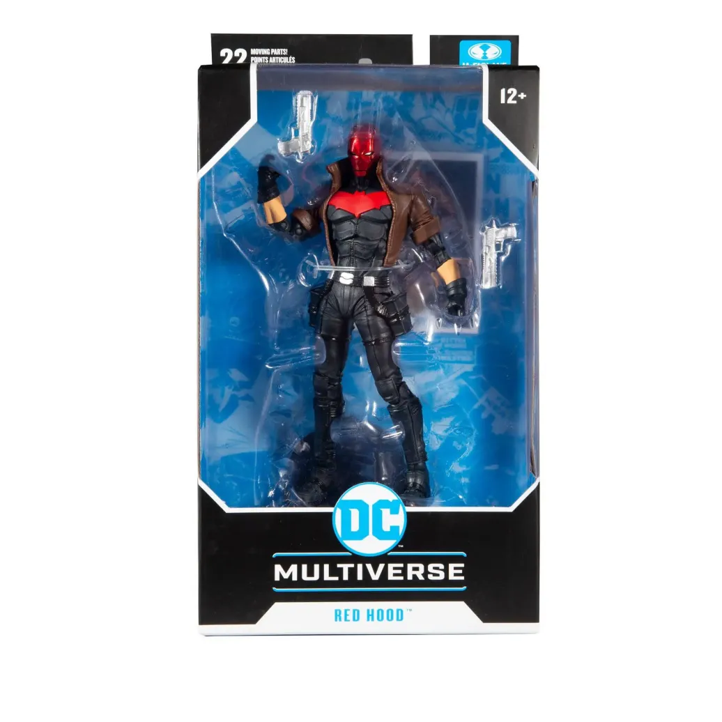 Aus dem DC Universum kommt diese detailreiche, bewegliche Red Hood Actionfigur. Sie ist ca. 18 cm groß und wird mit weiterem Zubehör und Base in einer bedruckten Fensterbox geliefert.