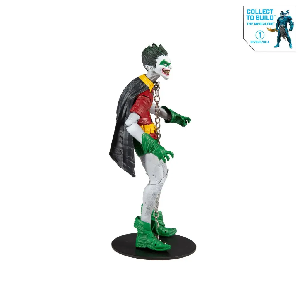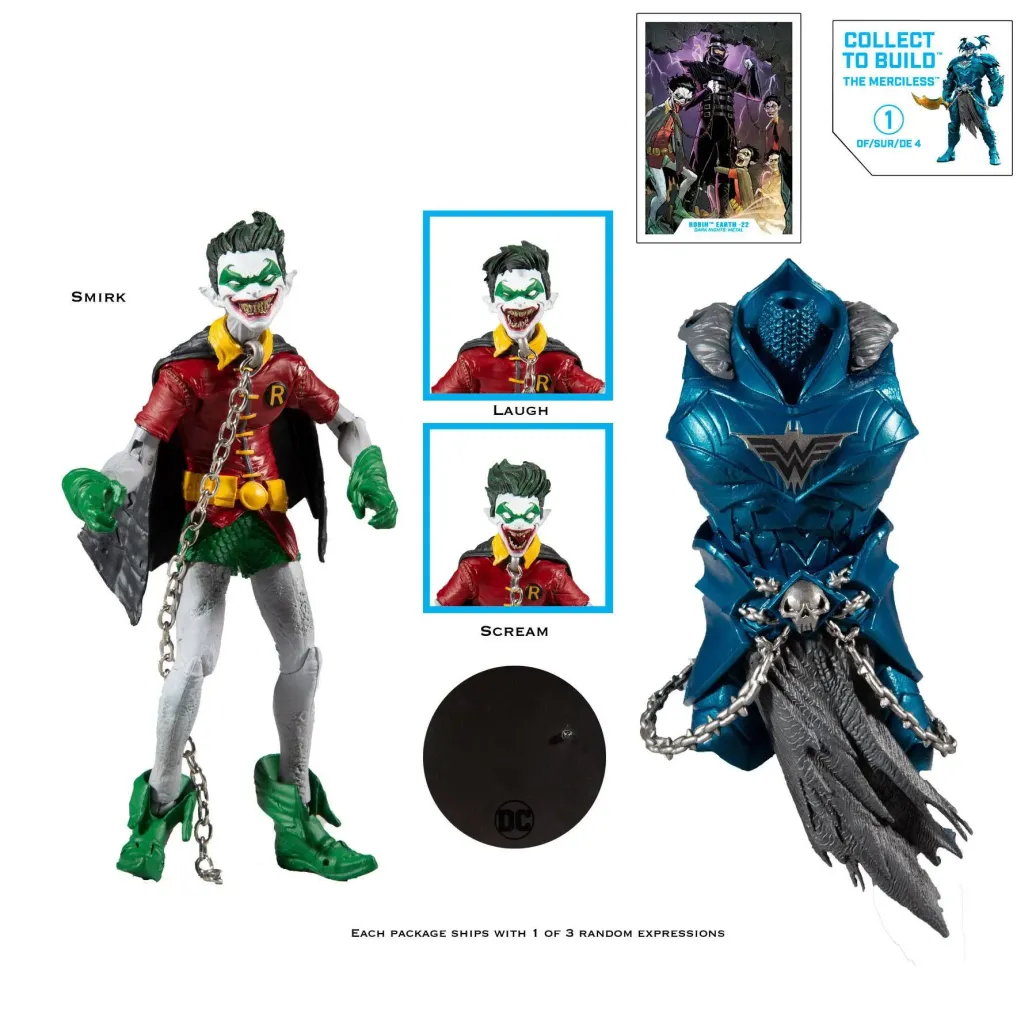 Aus der Comicbuch-Reihe DC Multiverse kommt diese detailreiche, bewegliche Robin Earth Dark Nights Metal Actionfigur. Sie ist ca. 18 cm groß und wird mit weiterem Zubehör, Base und Sammelkarte in einer bedruckten Fensterbox geliefert.