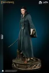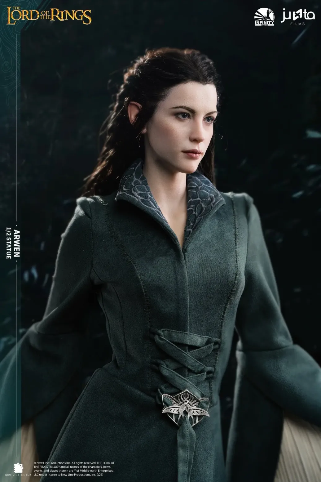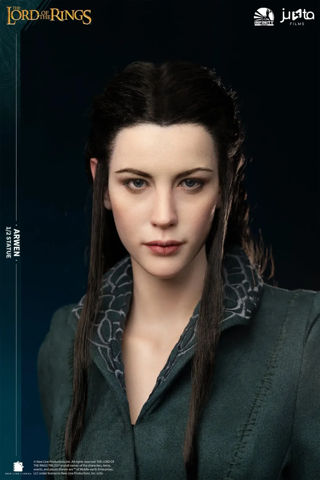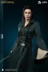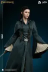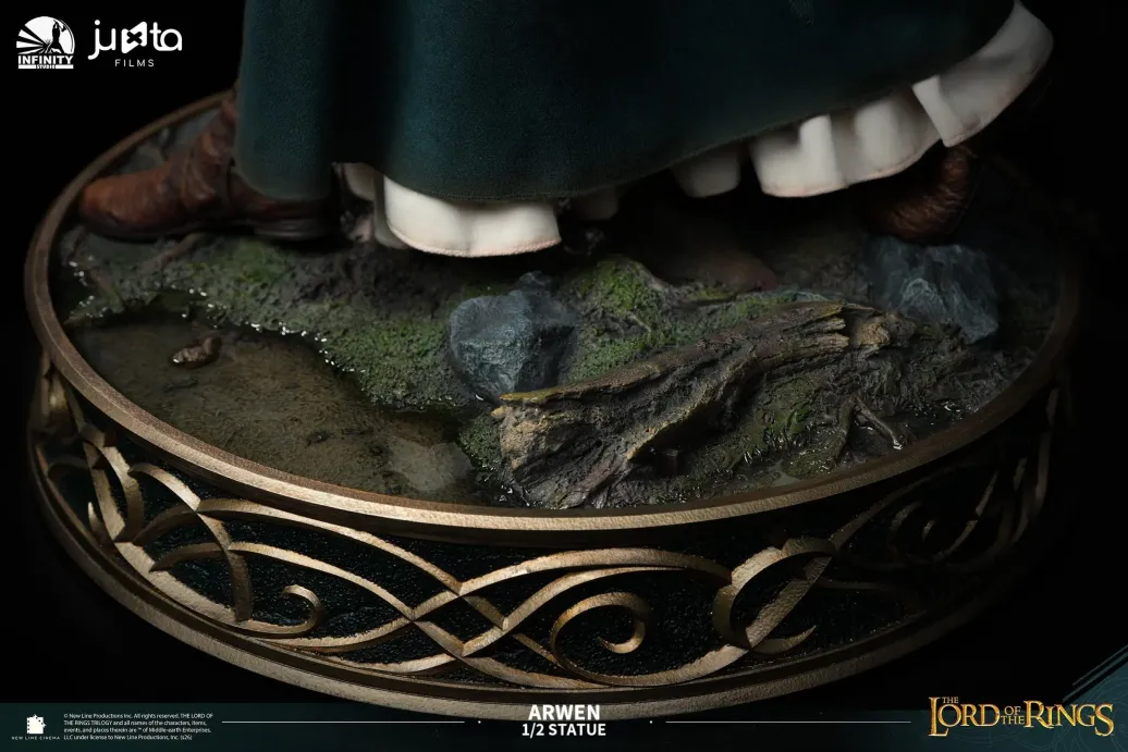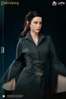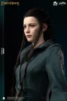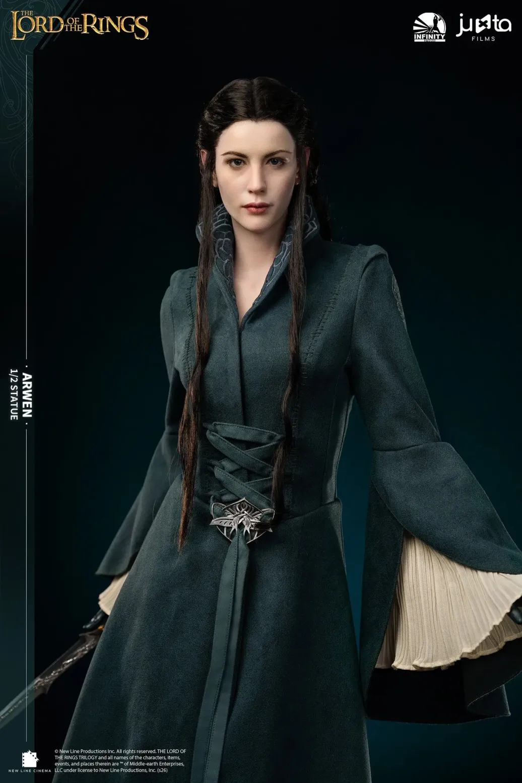Die Gesichtsskulptur von Prinzessin Arwen ist exquisit geschnitzt und fängt die heitere Anmut und zarte Schönheit ein, die einzigartig für die Elfenrasse ist. Ihr Haar ist sorgfältig mit Hochtemperatur-Seidenfasern implantiert. Die exponierte Haut ist aus hochwertigem Platin-Silikon gefertigt, das eine realistische Hauttextur mit einer zarten Berührung simuliert. Der Körper ist aus Polystone gegossen. Das dunkelgrüne äußere Gewand ist aus hochwertigem Stoff geschneidert. Das von Prinzessin Arwen gehaltene Schwert ist aus Metall gefertigt.