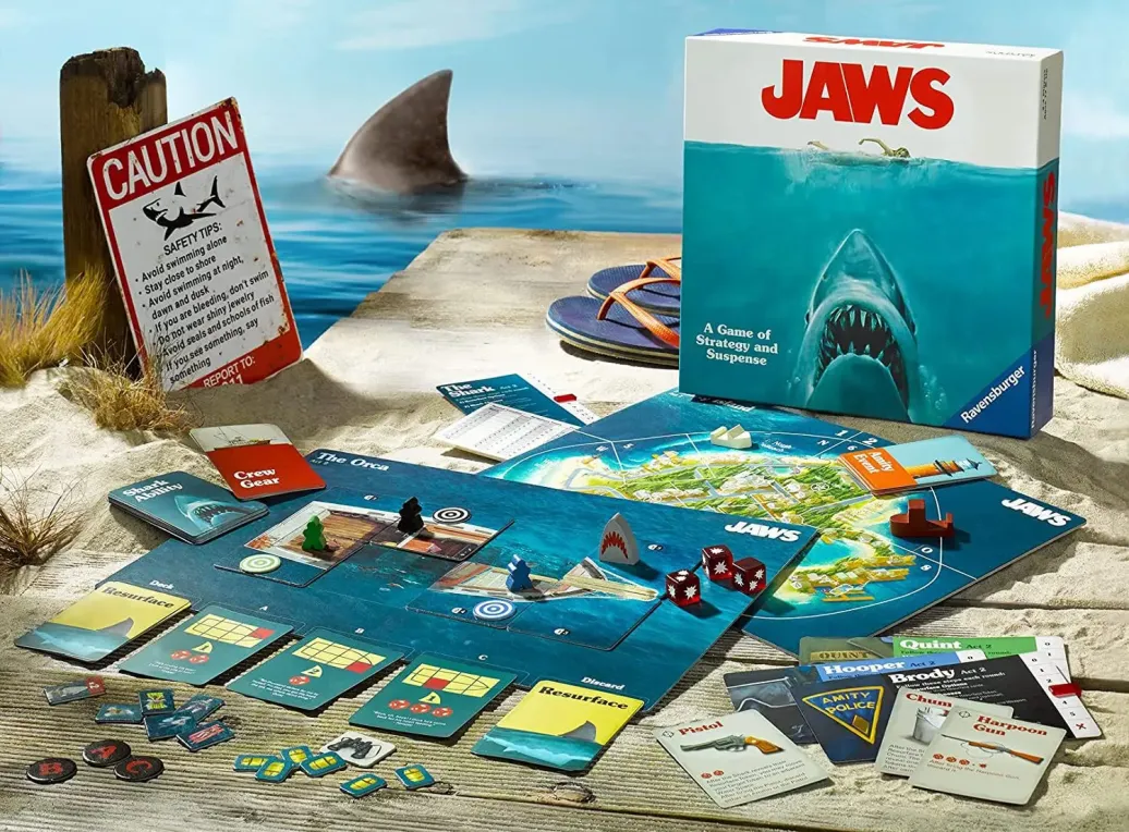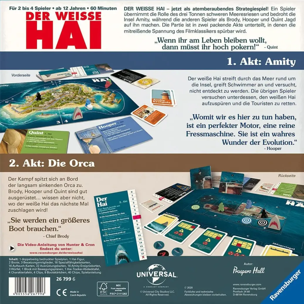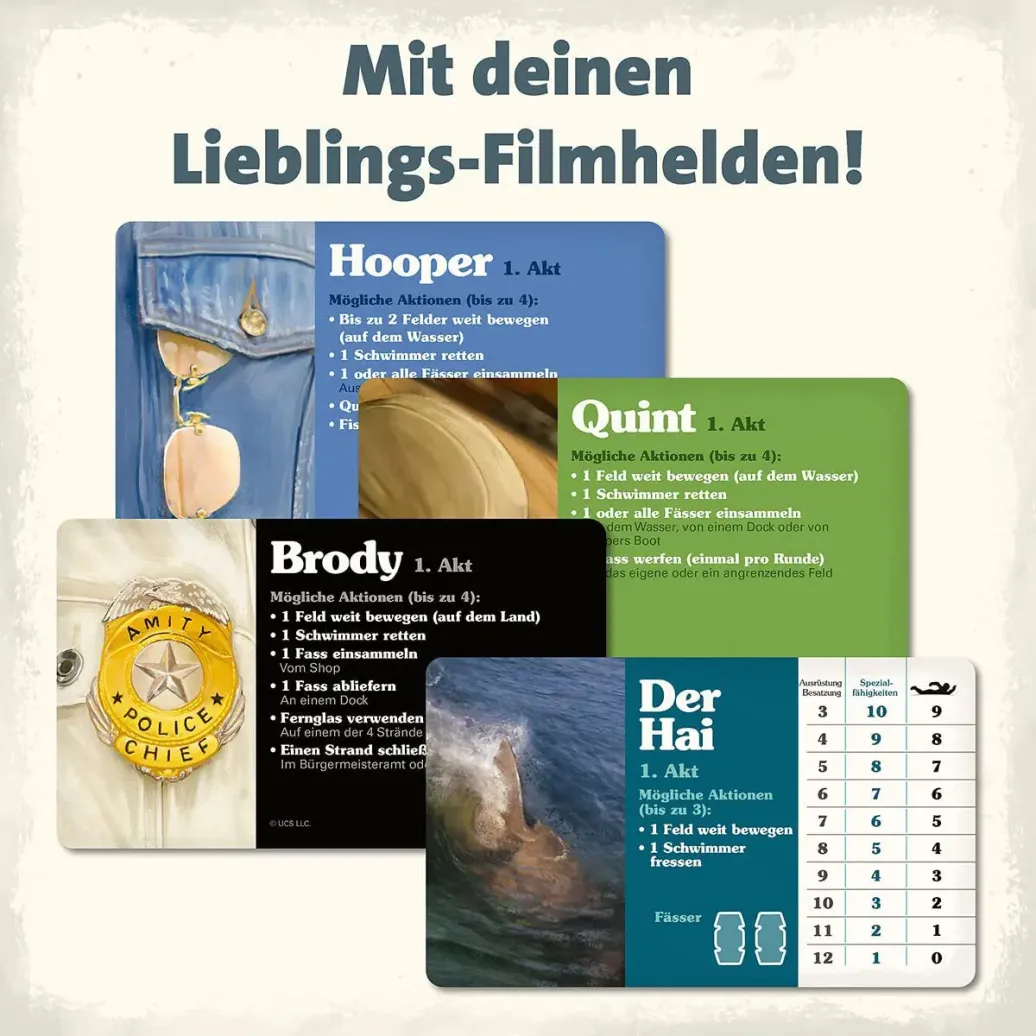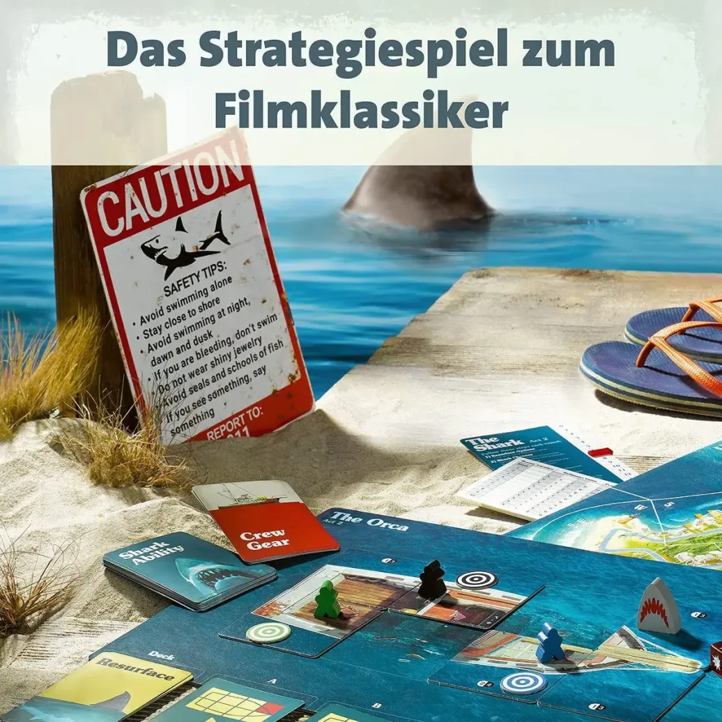 - Bei diesem spannenden Strategiespiel zum berühmten Filmklassiker von Steven Spielberg schlüpft ein Spieler in die Rolle des weissen Hais, während die weiteren Spieler ein Teil der Crew werden und versuchen, den Hai zur Strecke zu bringen