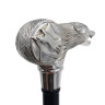 Der detailreiche Stock mit Metallspitze ist 109 cm lang und wurde aus Massivholz gefertigt und der Wolfkopf-Griff aus Metall.