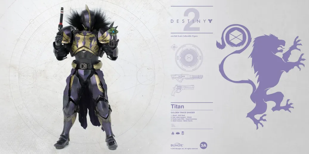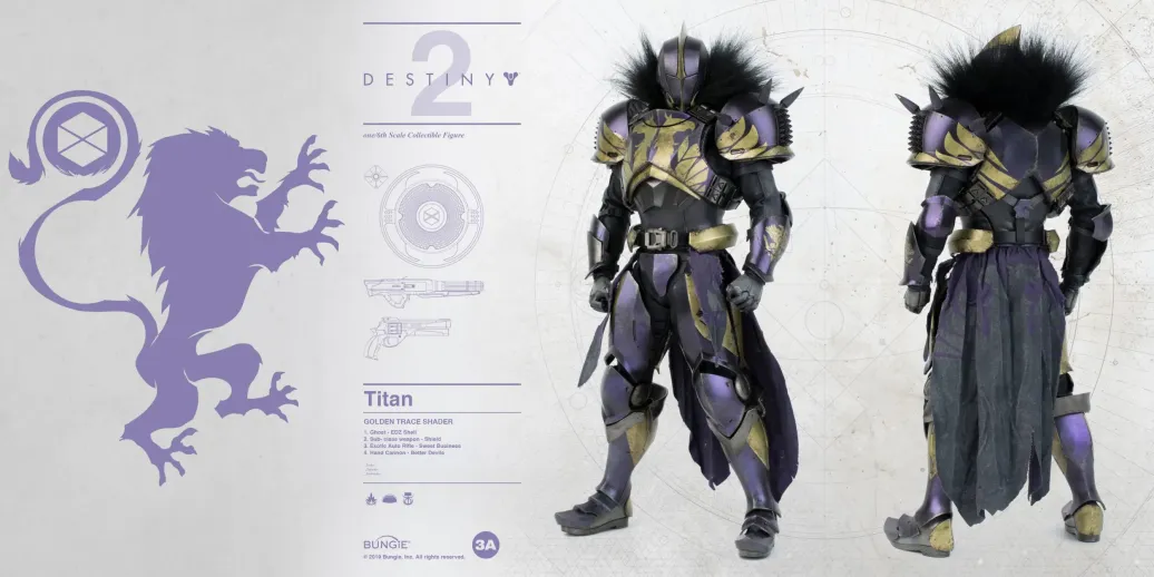 Zum erfolgreichen Videospiel Destiny 2 kommt diese herausragende Titan Golden Trace Shader Actionfigur. Sie ist etwa 32 cm groß, trägt echte Stoffkleidung und verfügt über insgesamt 32 Artikulationspunkte.