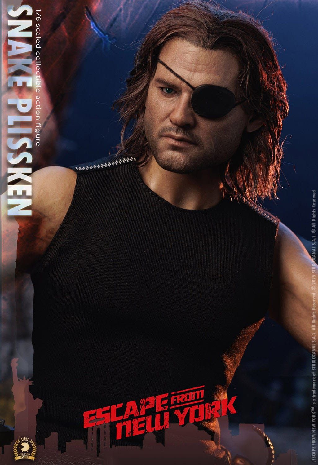 Zum John Carpenters "Die Klapperschlange" kommt diese großartige Actionfigur im Maßstab 1:6. Sie ist ca. 30 cm groß, trägt echte Stoffkleidung und wird mit zahlreichen Austausch- und Zubehörteilen in einer Fensterbox geliefert.