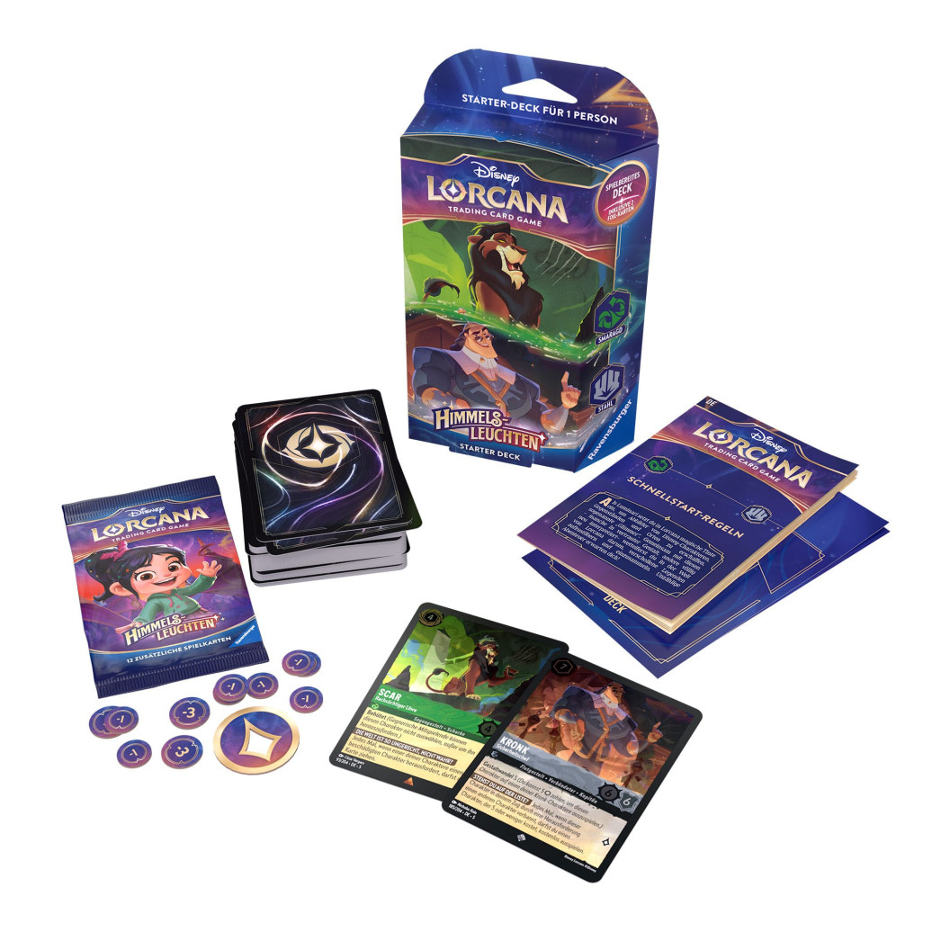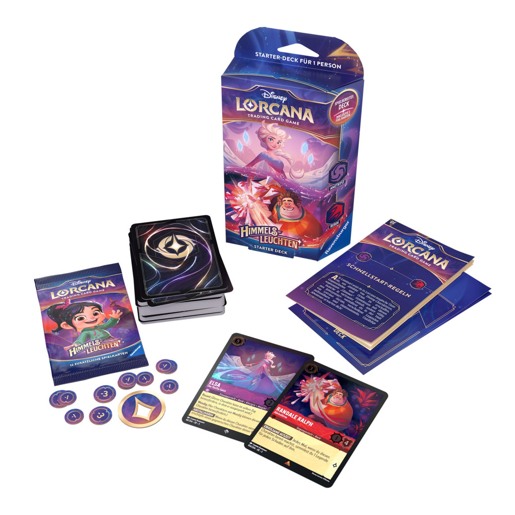Um Disney Lorcana zu spielen, benötigen alle Mitspielenden ein Deck mit sechzig Karten. Starter Decks enthalten ein vorgefertigtes Deck mit einem festgelegten Kartensatz. Wenn du noch nicht damit vertraut bist, dein eigenes Deck zu bauen, ist das ausgewogene und vom Lorcana Team getestete Starter Deck die ideale Basis.