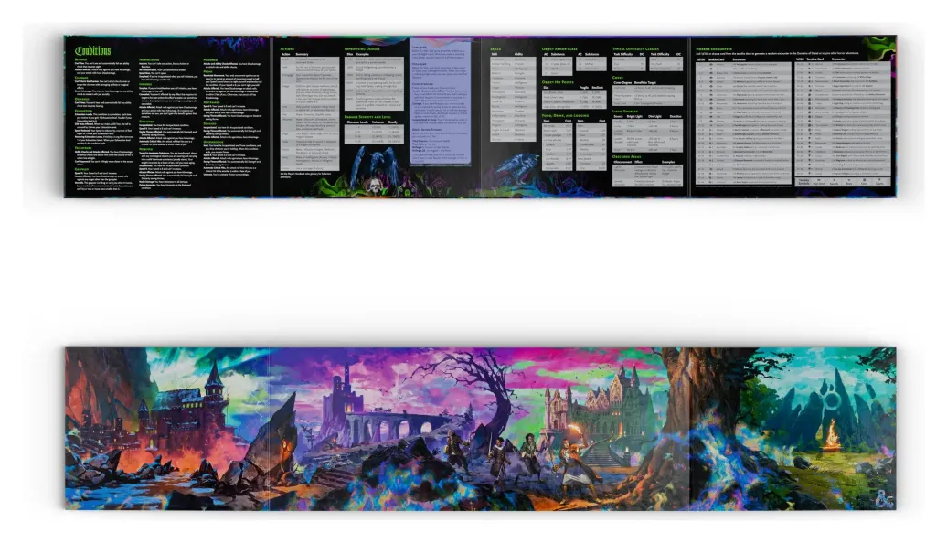 Verbergen Sie Ihre finsteren Pläne hinter dem Ravenloft: The Horrors Within Spielleiterschirm, während Sie wichtige Regeln griffbereit halten. Mit gotischen Kunstwerken und auf Horror ausgerichteten Referenztabellen versetzt dieser illustrierte, doppelseitige DM-Bildschirm Ihre Spieler in die sich ständig verändernden Nebel von Ravenloft. Ob Sie schleichenden Schrecken heraufbeschwören oder einen tragischen Fall inszenieren, dieser Bildschirm befähigt Sie, Albträume zu gestalten.