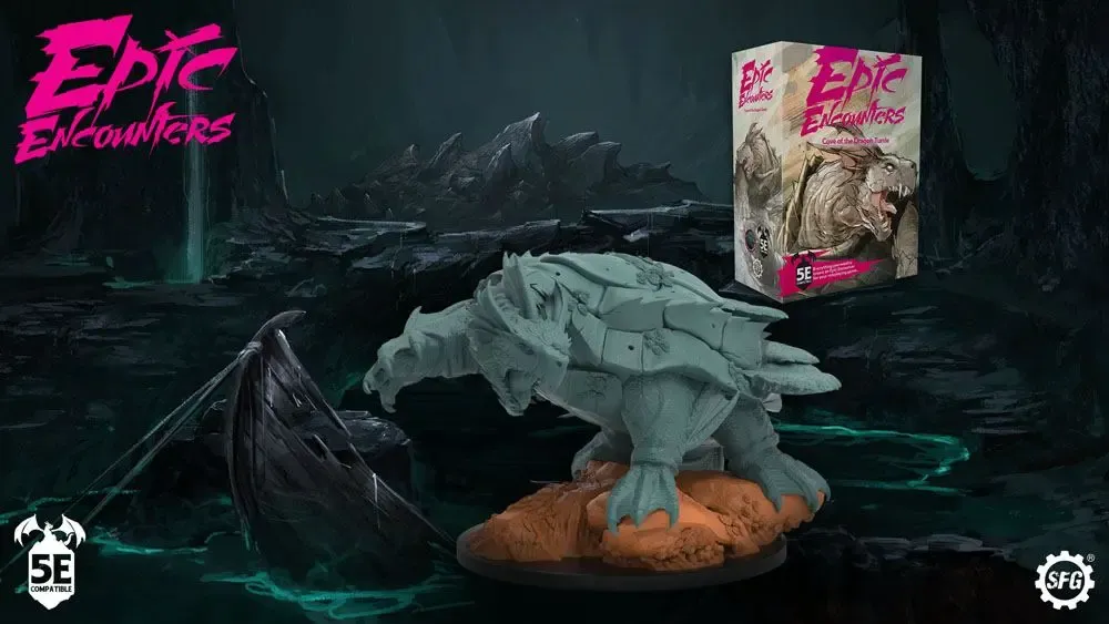 Cover Of The Dragon Turtle ist mit der fünften Edition oder jedem anderen Fantasy-Rollenspiel kompatibel und lässt die Spieler gegen eine riesige Kreatur aus der chinesischen Folklore antreten, die den gepanzerten Körper einer Schildkröte und den gerissenen Verstand eines Drachens besitzt.