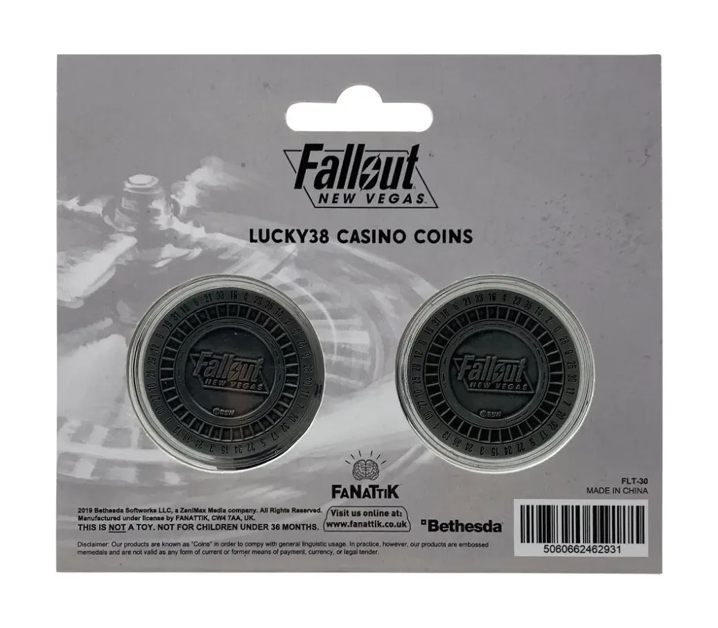 Offiziell lizenzierte Nachbildungen von Casino Münzen aus dem Videospiel Fallout: New Vegas. Die aus Metall (Zinklegierung) hergestellten Sammlerstücke werden in einer Blisterverpackung geliefert.