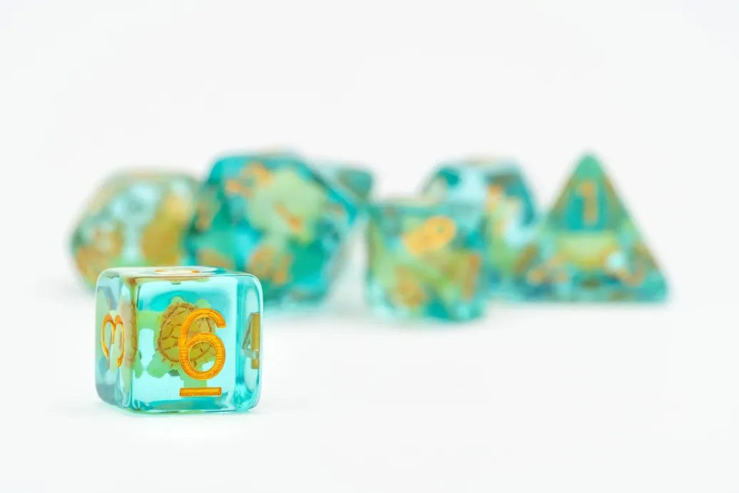 FanRoll-Würfel aus Harz haben einzigartige Einschlüsse, die jeden Spieltisch aufwerten. Es handelt sich um 16 mm große polyedrische Würfelsätze, die 7 Würfel enthalten (d4, d6, d8, d10, d10%(00-90), d12 und d20).