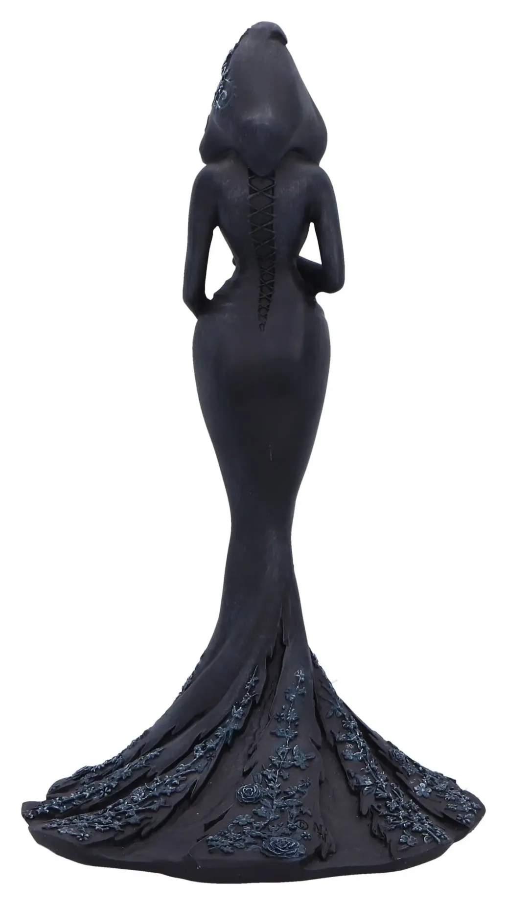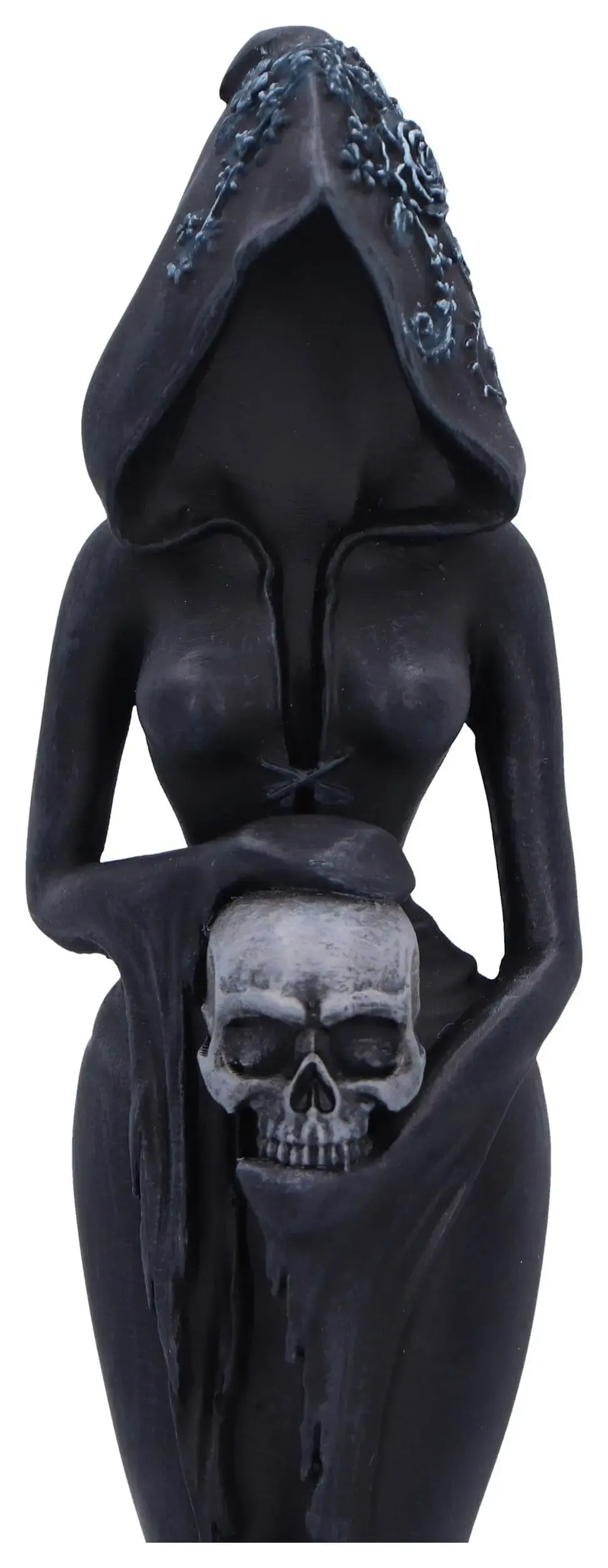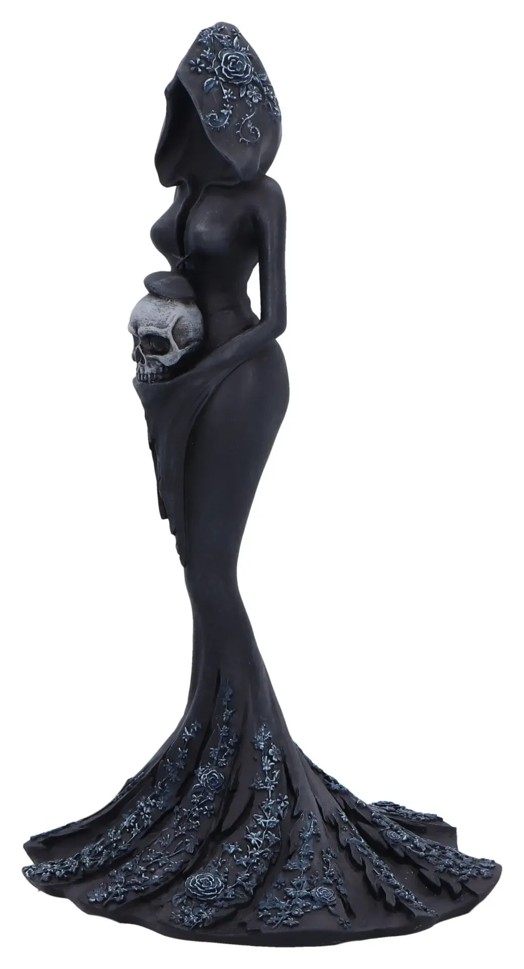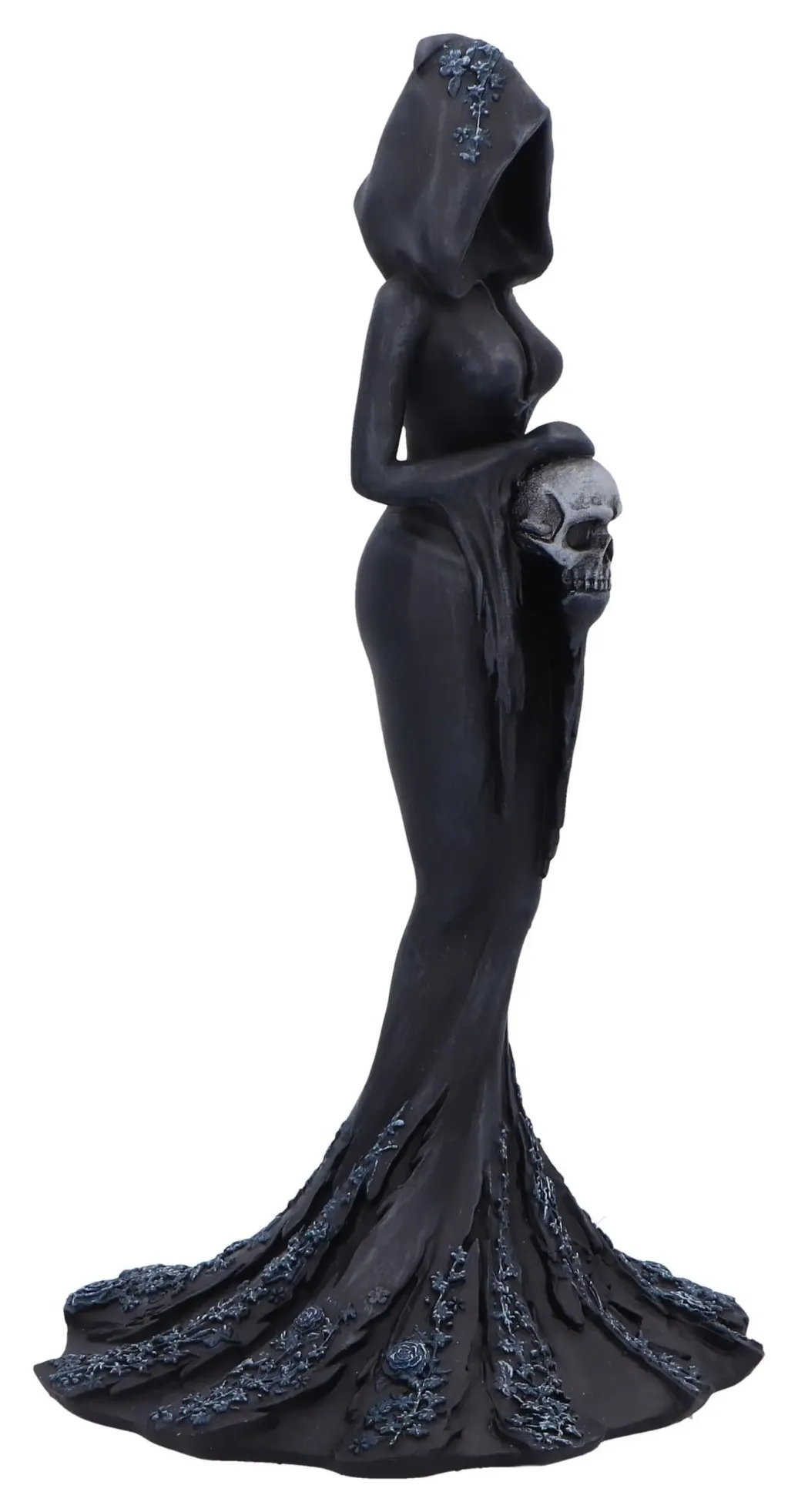 Eine fesselnde Gothic-Figur, die eine gesichtslose, verhüllte Frau darstellt, die zart einen Schädel hält, ein Originaldesign von Nemesis Now. Fachmännischer Harzguss, ein mattschwarzes Finish und elegante Blumenakzente auf dem fließenden Gewand. Verpackt in einer vollfarbigen Marken-Fensterbox, die sicherstellt, dass sie geschützt und sofort zum Ausstellen oder Verschenken bereit ist. Perfekt für Sammler gotischer Kunst, Fantasy-Enthusiasten und Liebhaber dunkler, weiblicher Symbolik.
