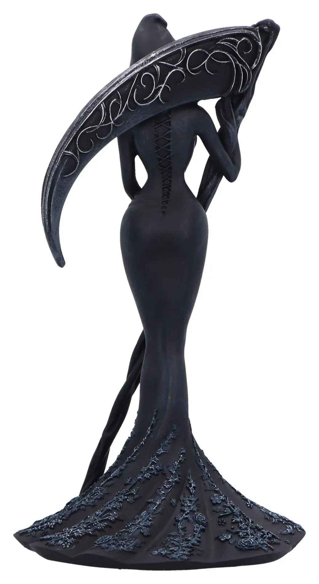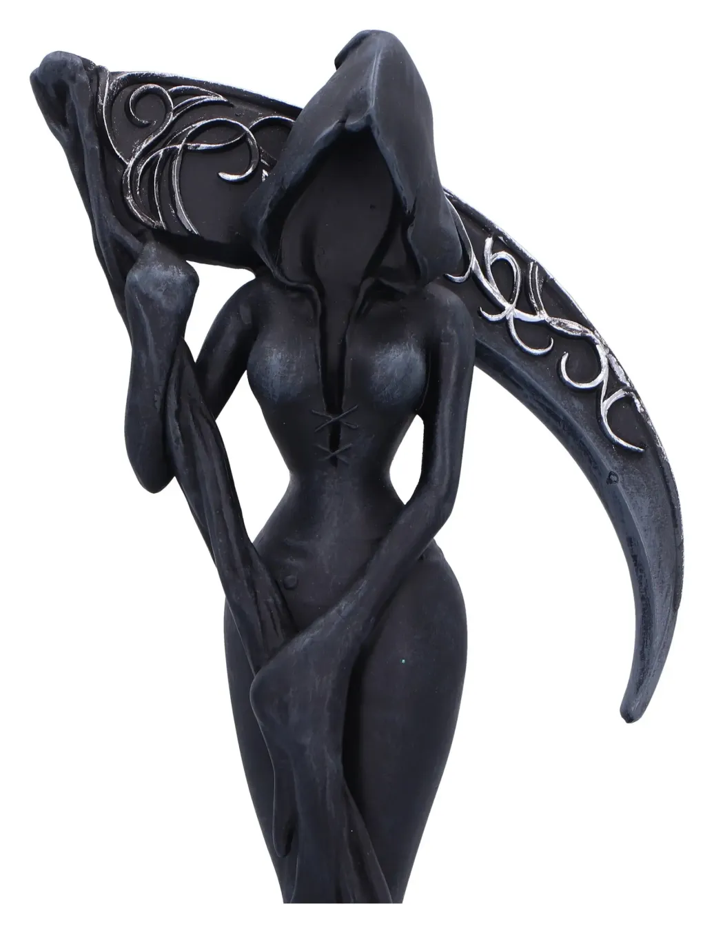 Eine unheimlich elegante Figur, die eine gesichtslose, verhüllte Frau mit einer Sense darstellt. Ein fein geformter Harzkörper, in Mattschwarz mit einer markanten Sense vollendet, strahlt Geheimnis und Macht aus. Verpackt in einer Marken-Fensterbox, die sicherstellt, dass sie sicher ankommt und bereit zum Ausstellen oder Verschenken ist. Großartig für Sammler von Gothic-Dekor, Fantasy-Fans und Bewunderer dunkler weiblicher Symbolik.