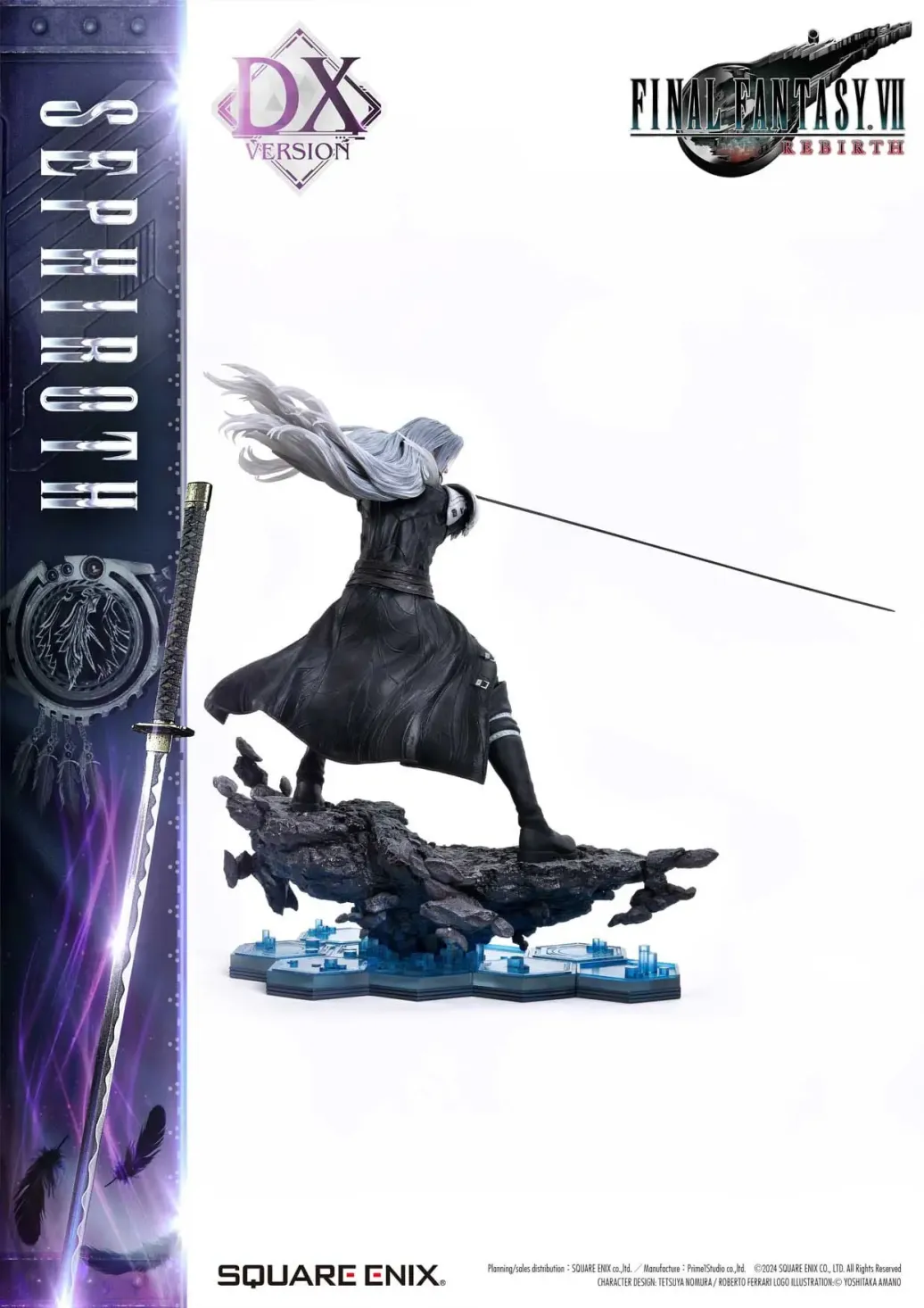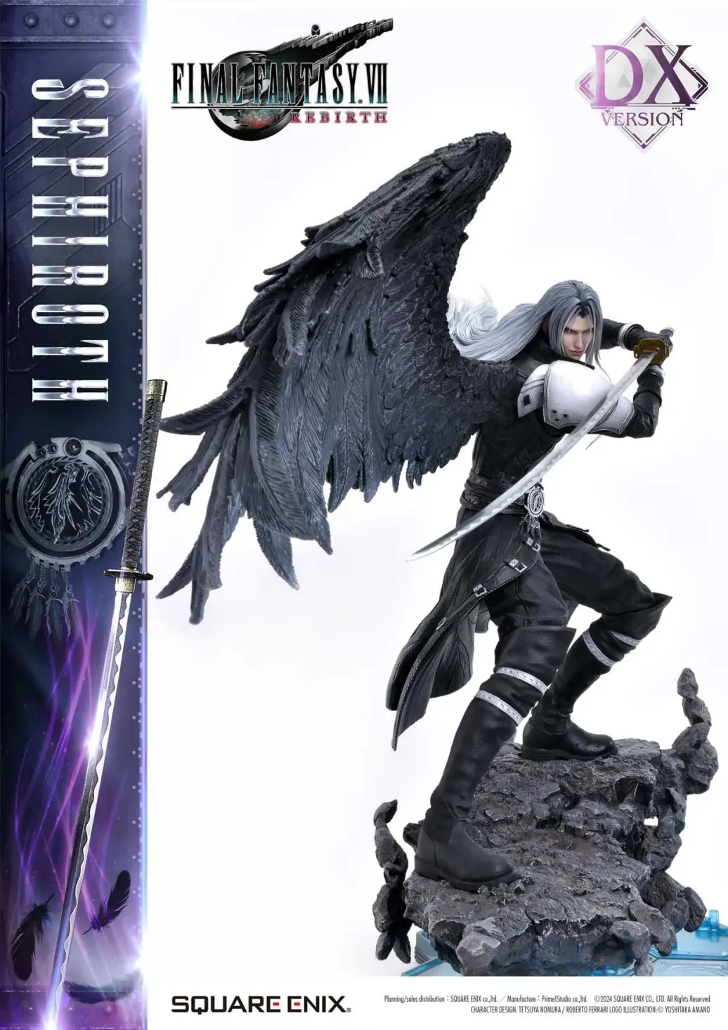 Das lange Schwert verströmt stille Gefahr und seine selbstsichere Haltung fängt Sephiroths Einstellung aus dem Spiel ein. Seine Szenen aus dem Spiel wurden genau analysiert, um eine Statue im Maßstab 1:4 zu schaffen, welche die Pose aus dem Spiel, an die sich jeder erinnert, abzubilden. Sein langes, silbernes Haar wogt hinter ihm und seine von Mako gefärbten Augen haben einen irren Glanz. Masamune verzaubert mit einem wunderschönen Muster auf der Klinge und aus Sephiroths rechter Schulter ragt ein rabenschwarzer Flügel. Farbe und Form dieser Statue sind mit vielen durchdachten Details versehen worden und die Handwerkskunst, die nur nach dem Bestem strebt, ist in jedem Detail zu erkennen.