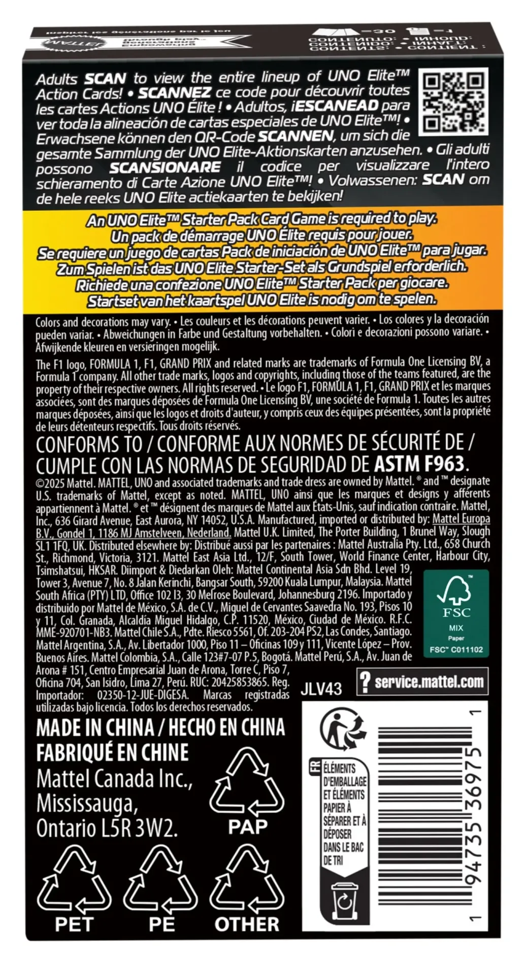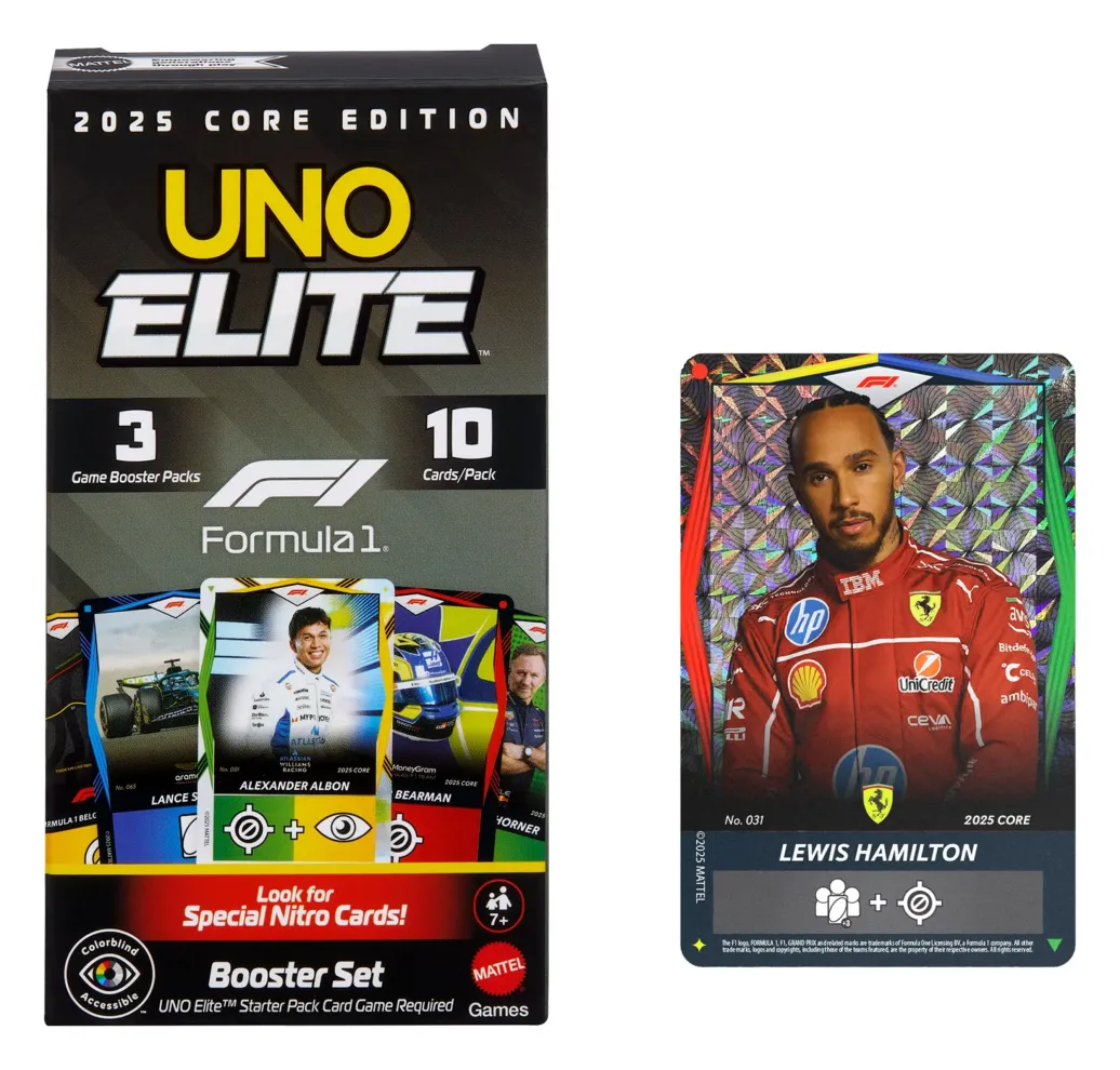 Werden die Karten des UNO Elite Formel 1 2025 Core Edition Erweiterungssets einem UNO Elite Formel 1 Kartenspiel hinzugefügt, wird das Rennen beschleunigt. Jedes Set enthält 3 Erweiterungssets, jeweils mit 10 Elite-Sonderkarten, also insgesamt 30 Karten. Welche Karte wird nun ausgeteilt? Jede Elite-Sonderkarte verfügt über ihre eigene besondere Stärke, die zum Einsatz kommt, wenn ein Spieler eine Karte mit einem Elite-Symbol darauf ausspielt. Und natürlich dürfen die Spieler nicht vergessen, laut „UNO!“ zu rufen, wenn sie nur noch eine Karte auf der Hand haben! Dieses Spiel mit Rennfahr-Thema ist ein großartiges Geschenk für alle Formel-1- und Kartenspiel-Fans ab einem Alter von 7 Jahren. Abweichungen in Farbe und Gestaltung vorbehalten.