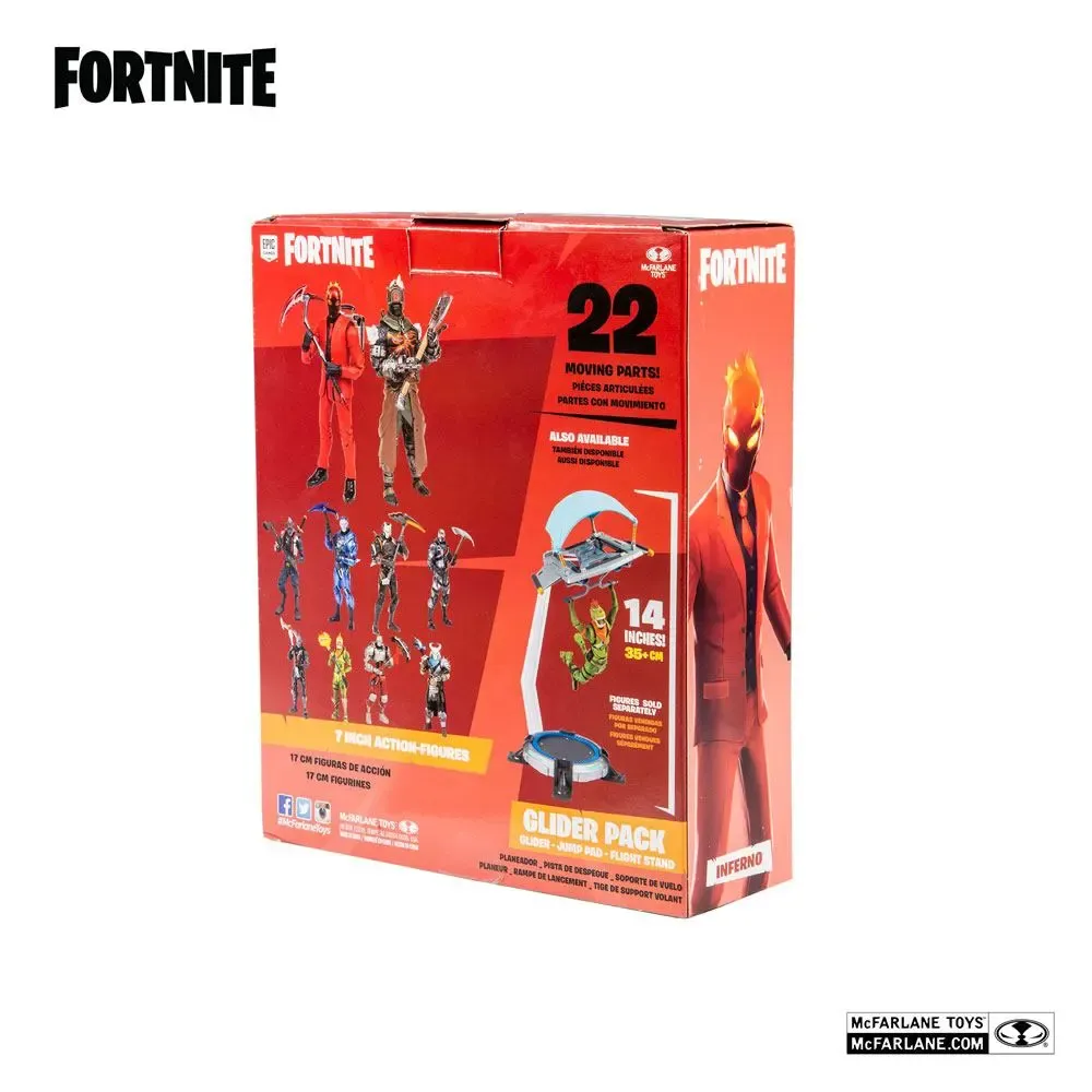 Zum Videospiel Fortnite kommt diese detailreiche, bewegliche Inferno Actionfigur. Sie ist ca. 18 cm groß und wird mit weiterem Zubehör und Base in einer bedruckten Fensterbox geliefert.