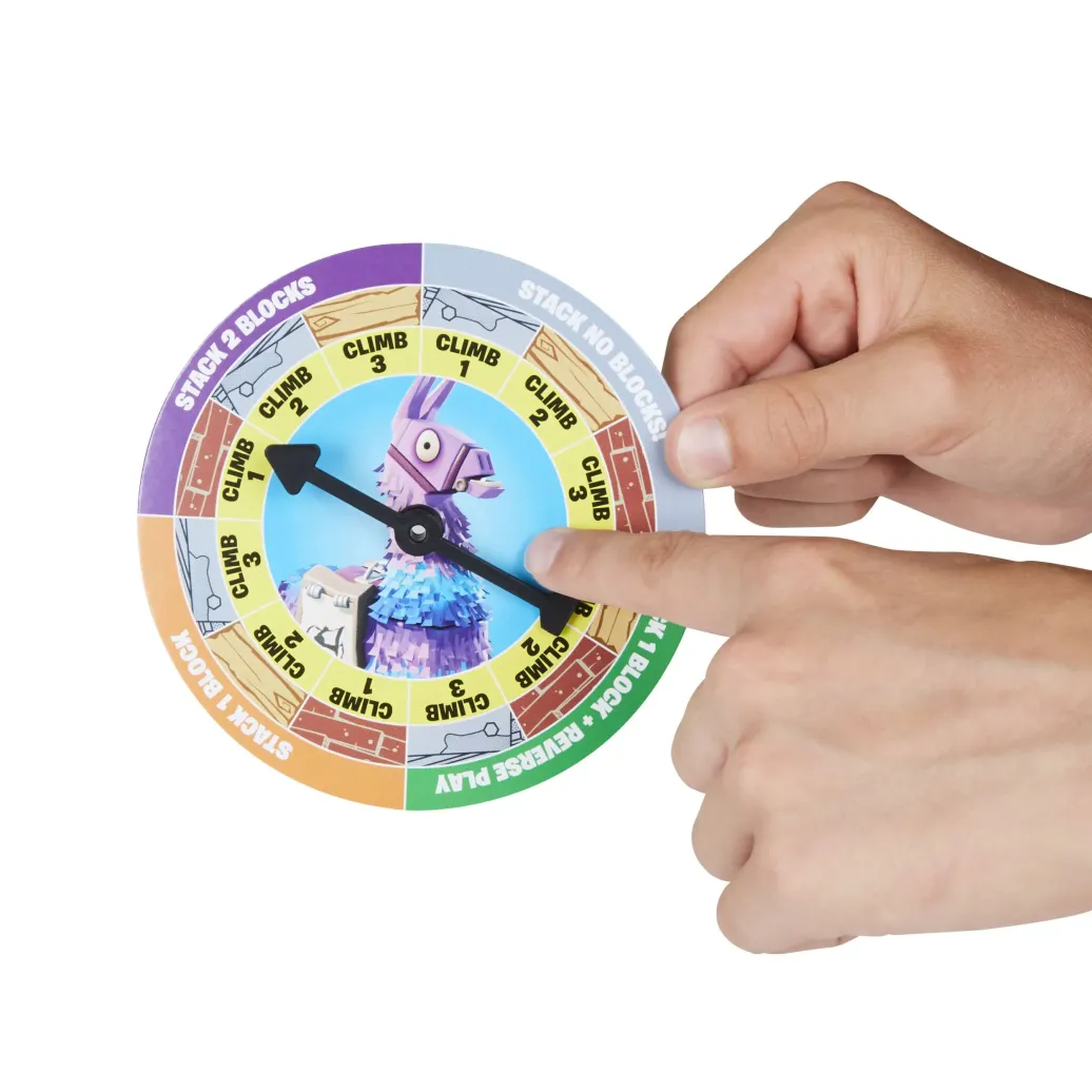 Passend zum Fortnite Videospiel gilt es bei Jenga Fortnite, mit dem eigenen Fortnite Helden den Turm zu erstürmen, um als erster Spieler die Turmspitze zu erreichen. Doch aufgepasst... stürzt der Turm ein, während ein Spieler an der Reihe ist, dann fliegt dieser Spieler aus dem Spiel. Durch Drehen der Scheibe wird der nächste Schritt enthüllt - wie viele Etagen es zu erklimmen gilt und welche Art von Holzklotz zu stapeln ist. Es ist ein spannender Kampf an die Spitze, wenn die Spieler ihre Helden in Form von kleinen Figurenstiften nach oben klettern lassen und ihre Rivalen nach unten schicken - und all das, ohne den Turm einstürzen zu lassen. Eine tolle Spielerfahrung für Fans von Fortnite und Jenga Stapler.
