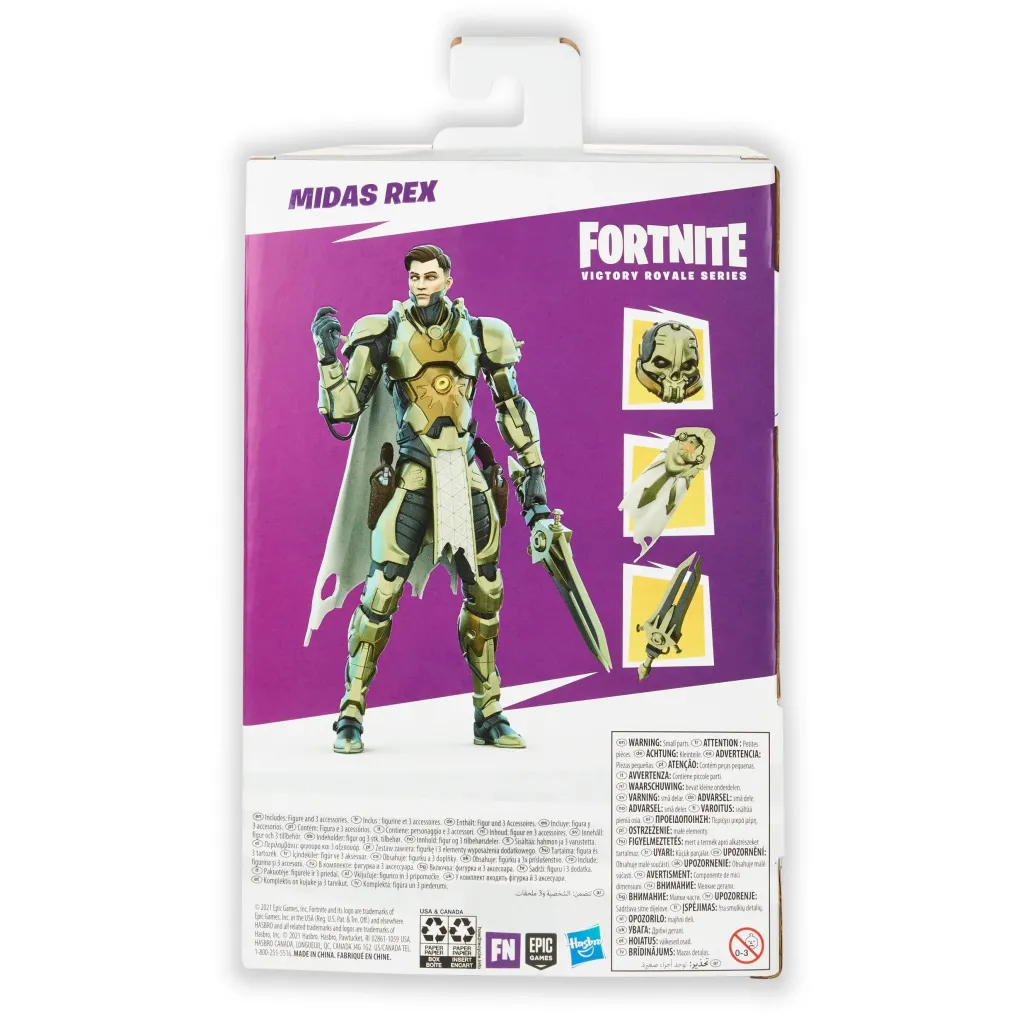 Midas Rex stürzt aus dem Schlachtenbus herab und gleitet in die Victory Royale Series. Diese 15 cm große Action-Figur zeigt das berühmte Outfit mit einem zum Spiel passenden Dekor und Details. Sie kommt mit einem Königsmacher Erntewerkzeug und einem Midas-Wappen Rücken-Accessoire. Ebenfalls enthalten ist ein Helm als Zweit-Kopf, der vom Midas Rex Helm inspiriert ist. Dank mehr als 20 Bewegungspunkten kann die Midas Rex Figur für einen epischen Kampf in Szene gesetzt oder für ein Dance Battle positioniert werden.