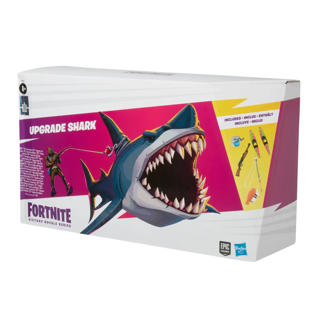 Hier wird wohl eine größere Angel nötig sein! Diese 15 cm große Upgrade Shark Action-Figur kommt im Design aus dem Spiel, hat ein bewegliches Maul und ein geformtes Inneres! Wird die Upgrade Shark Figur in der Mitte geöffnet, kommen Accessoires zum Vorschein! Enthält ein Shrimpy-Rückenaccessoireset, eine Angel, Shield Potion, 2 Wasserskis und eine Pumpgun als Accessoires. Die Wasserskis können an anderen Figuren angebracht und die Angel an der Rückenflosse von Upgrade Shark befestigt werden, um so zu tun, als würde er die Figur stilvoll durch's Wasser ziehen!