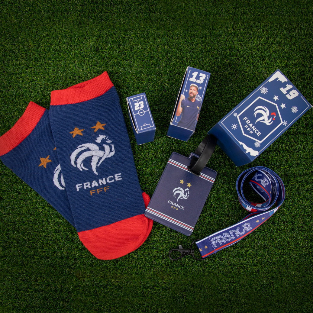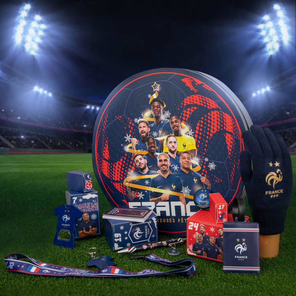 Offiziell lizenzierter Adventskalender mit 24 Geschenkartikeln zum Thema French Football Federation. (Stift, Anstecker, Socken, Radiergummi, Kordelzugbeutel, Metall-Schlüsselanhänger, Tragetasche, Magnet, Notizblock, Prellball, Flaschenöffner, Brillenetui, Schlüsselband, Handschuhe, Einkaufstasche, Gepäckanhänger, Kordelzugbeutel, Söckchen, Weihnachtskugeln, Armband, gewebter Aufnäher, Notizbuch, Magnetset)