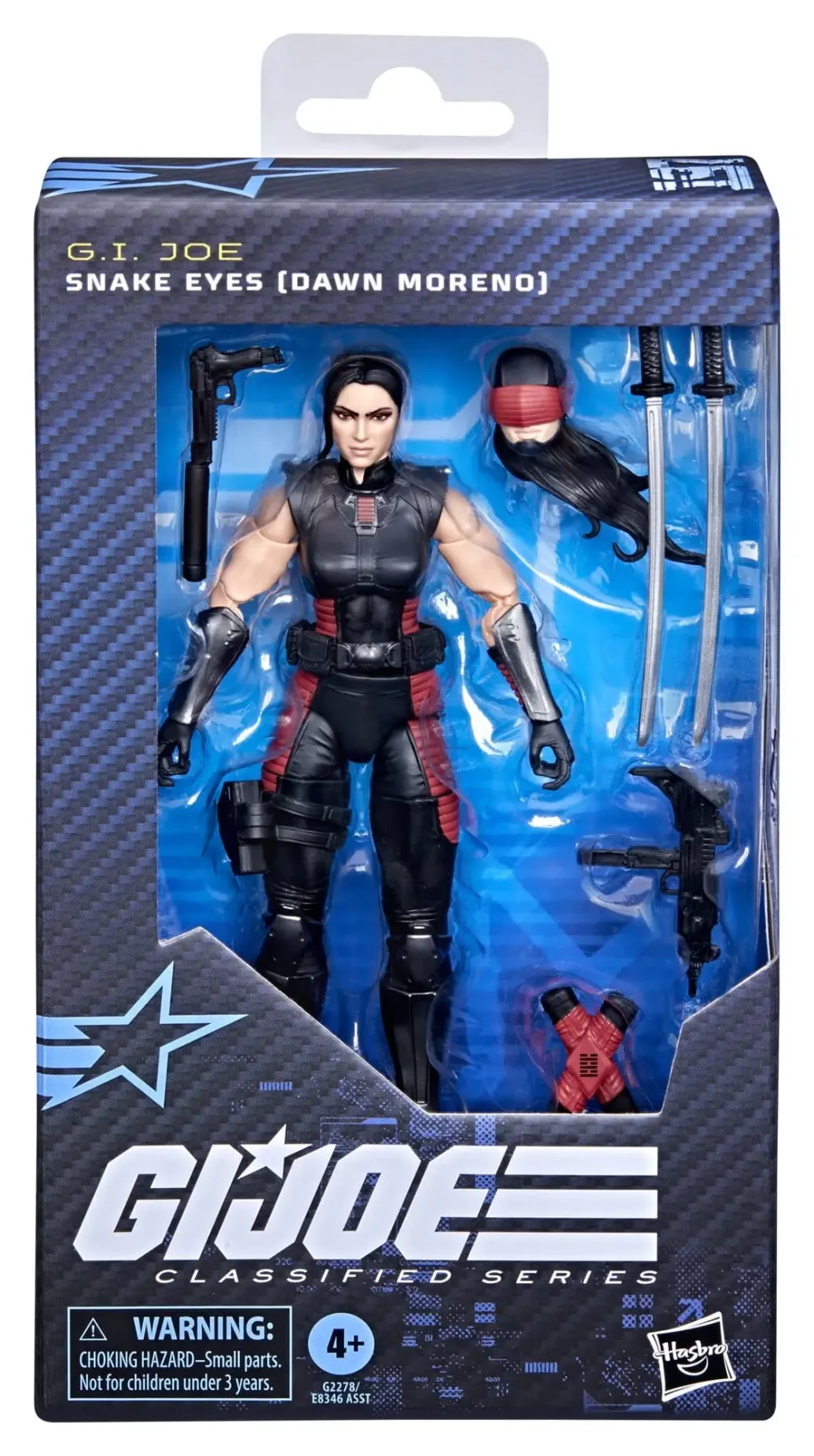 G.I. Joe ist ein speziell ausgebildetes, auf Abruf bereit stehendes Sonderkommando von Männern und Frauen aus der ganzen Welt mit dem Auftrag, die Welt vor Cobra zu schützen, einer skrupellosen, kriminellen Organisation, die es auf die Weltherrschaft abgesehen hat. Die mutigen Mitglieder von G.I. Joe sind bereit, Cobra an jedem Ort der Erde aufzuspüren. Wo auch immer Ärger herrscht, ist G.I. Joe zur Stelle. Snake Eyes (Dawn Moreno) gesellt sich zur G.I. Classified Series und ist mit mehreren Bewegungspunkten bereit für das nächste Abenteuer. Diese Snake Eyes (Dawn Moreno) Figur des bei Fans beliebten Comicbuchcharakters aus A Real American Hero erscheint erstmals als Action-Figur in der Spielzeuglinie G.I. Joe. Snake Eyes (Dawn Moreno) enthält 7 charakteristische Zuberhörteile, darunter einen austauschbaren maskierten Kopf, 2 Katana-Schwerter, eine Doppel-Saya-Scheide und Waffenaccessoires. Als Jugendliche vor einem trostlosen Leben bei Cobra gerettet. Zu einer Ninja-Meisterin ausgebildet. Erbte Snake Eyes Erinnerungen durch einen Hirnstrom-Scanner. Listig. Schnell. Tödlich. Dawn ist zweifelsfrei ein Joe.