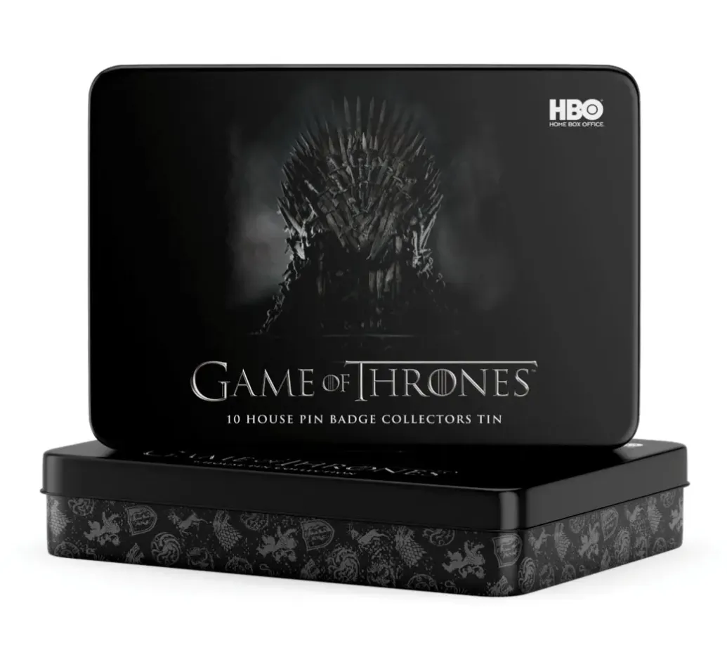 10 offiziell lizenzierte Game of Thrones Ansteck-Pins aus Metall (Zinklegierung). Verpackt in einer schicken Metalldose (Größe: 18 x 14,5 x 3 cm).