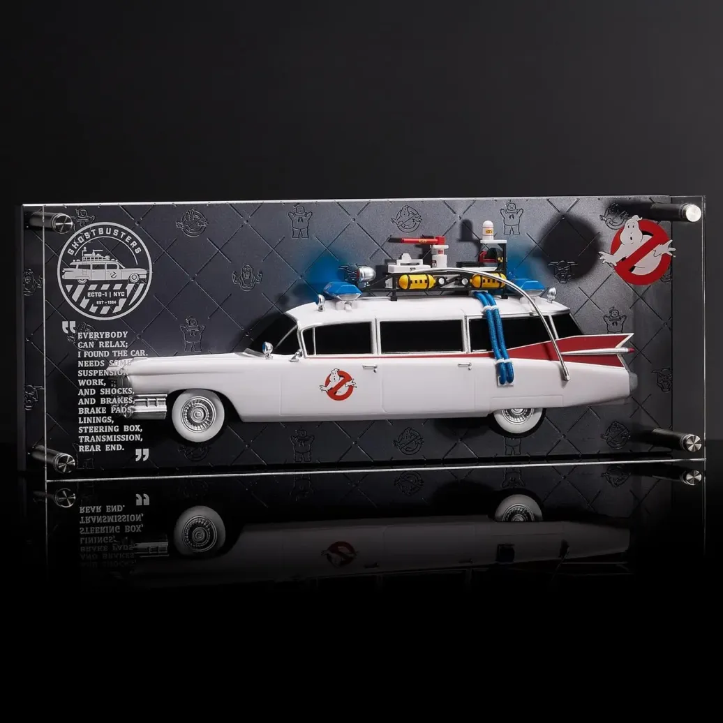 Im Gegensatz zu flachen Postern oder Blechschildern handelt es sich hier um ein massives 3D-Relief. Der Cadillac Miller-Meteor ragt plastisch hervor, komplett mit den ikonischen Heckflossen, den Sirenen auf dem Dach und dem Ghostbusters-Logo auf der Tür. Ein besonderes Detail verbirgt sich auf der Rückwand (Backplate): Wenn Sie genau hinsehen, entdecken Sie dort Fan-Lieblinge wie Slimer, den Stay Puft Marshmallow Man und einen Terror Dog, die sich im Hintergrund tummeln.