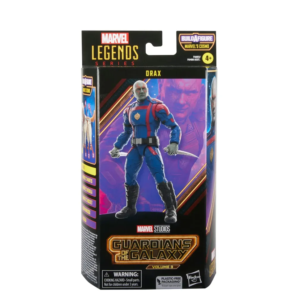 Diese 15 cm große Marvel Legends Sammelfigur ist nach Drax' Erscheinung aus Guardians of the Galaxy Vol. 3 der Marvel Studios gestaltet und präsentiert sich mit Premium-Details, mehreren Bewegungspunkten und 3 filmgetreuen Accessoires wie Messern.