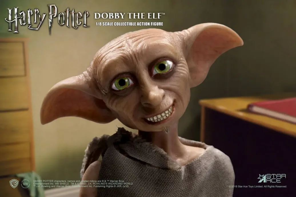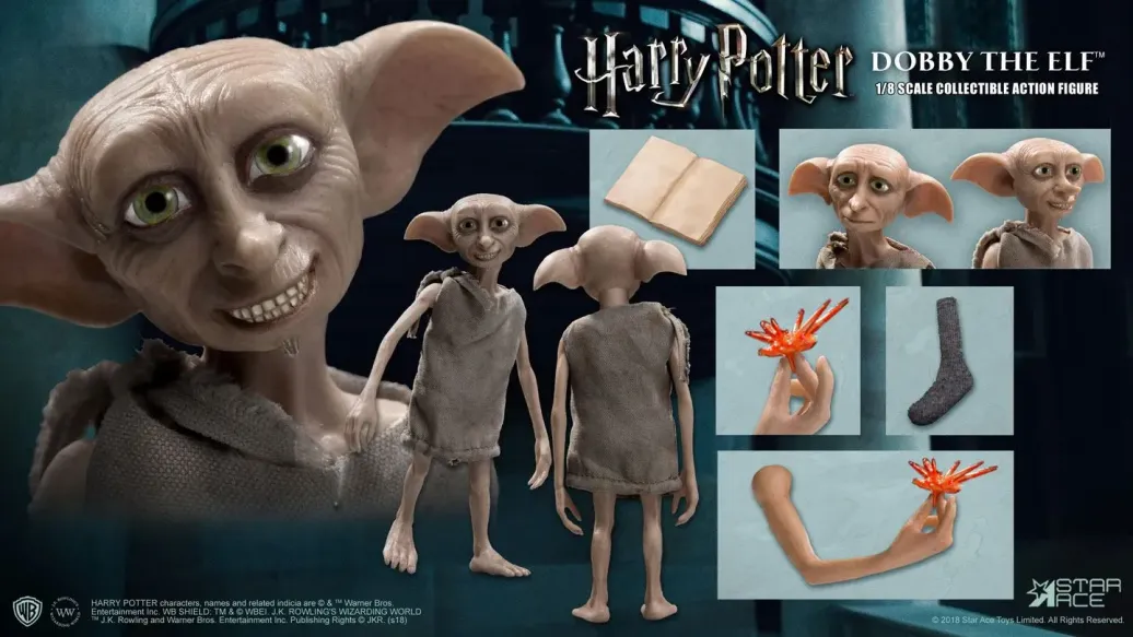 Diese großartige Dobby Actionfigur im Maßstab 1/8 aus dem Harry Potter Universum ist ca. 12 cm groß, trägt echte Stoffkleidung und wird mit weiterem Zubehör und Austauschteilen in einer Fensterbox geliefert.